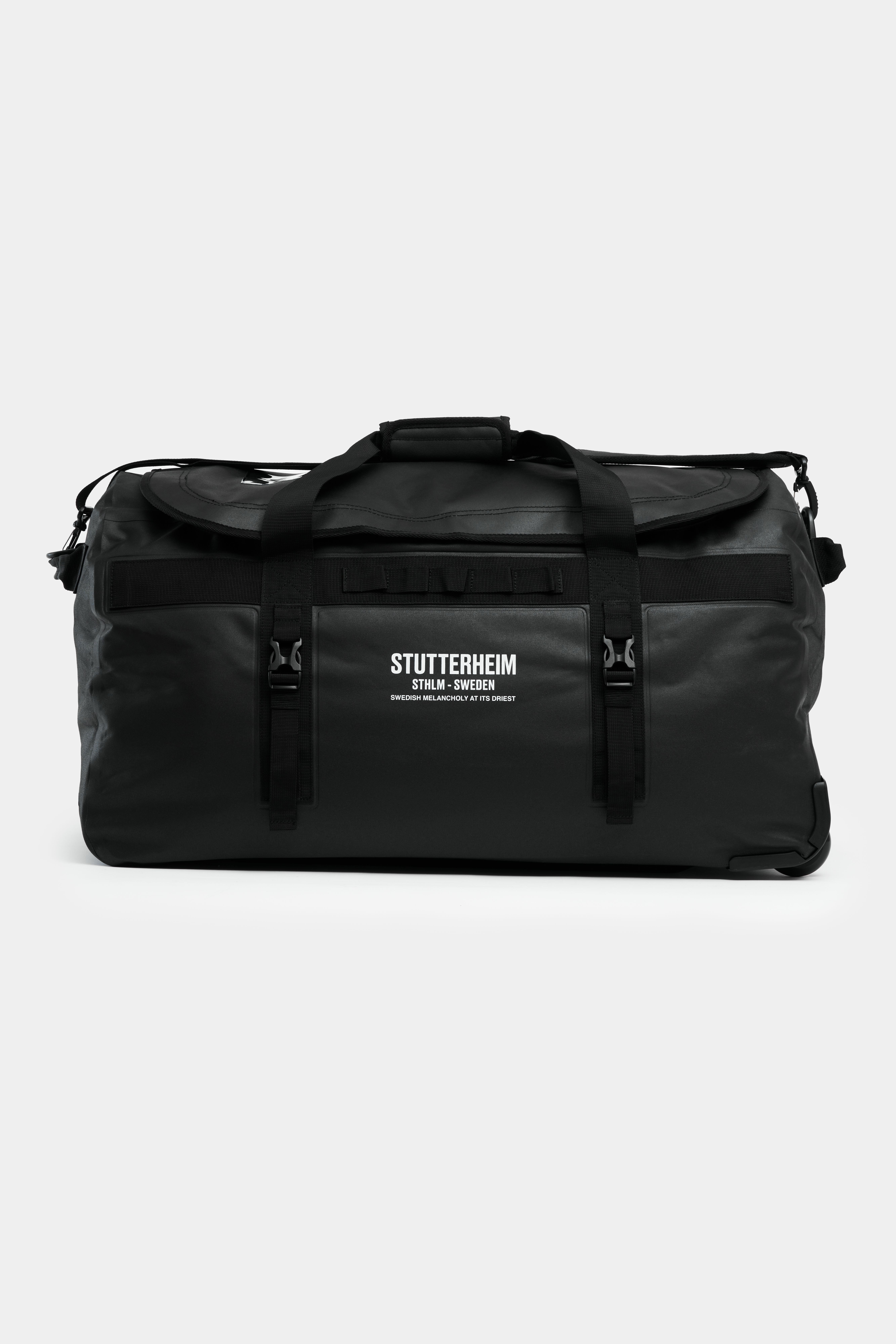 Rain Trolley is a large waterproof suitcase that can be used as a wheelie bag or as a duffel bag. Equipped with wheels and a telescopic handle as well as an adjustable crossbody strap, it is possible to alternate between ways of carrying and adjust according to the weight of the load. An inner mesh pocket, as well as a compartment on the top lid, allows for clever packing while the generous size of the main compartment leaves enough room even for the heaviest of packers – this is the ultimate suitcase. GARMENT DETAILS • Completely waterproof • Telescopic handle • Wheels • Adjustable crossbody strap • Top handle • Inner mesh compartment • Zipped top lid compartment • 8000 mm water column pressure • Designed in Stockholm • Height: 40 cm / 15" • Length: 70 cm / 27" • Width 37 cm / 14" • Capacity: 115 litres / 30 gallons MATERIAL 87% PVC and 13% polyester Read more about our fabrics