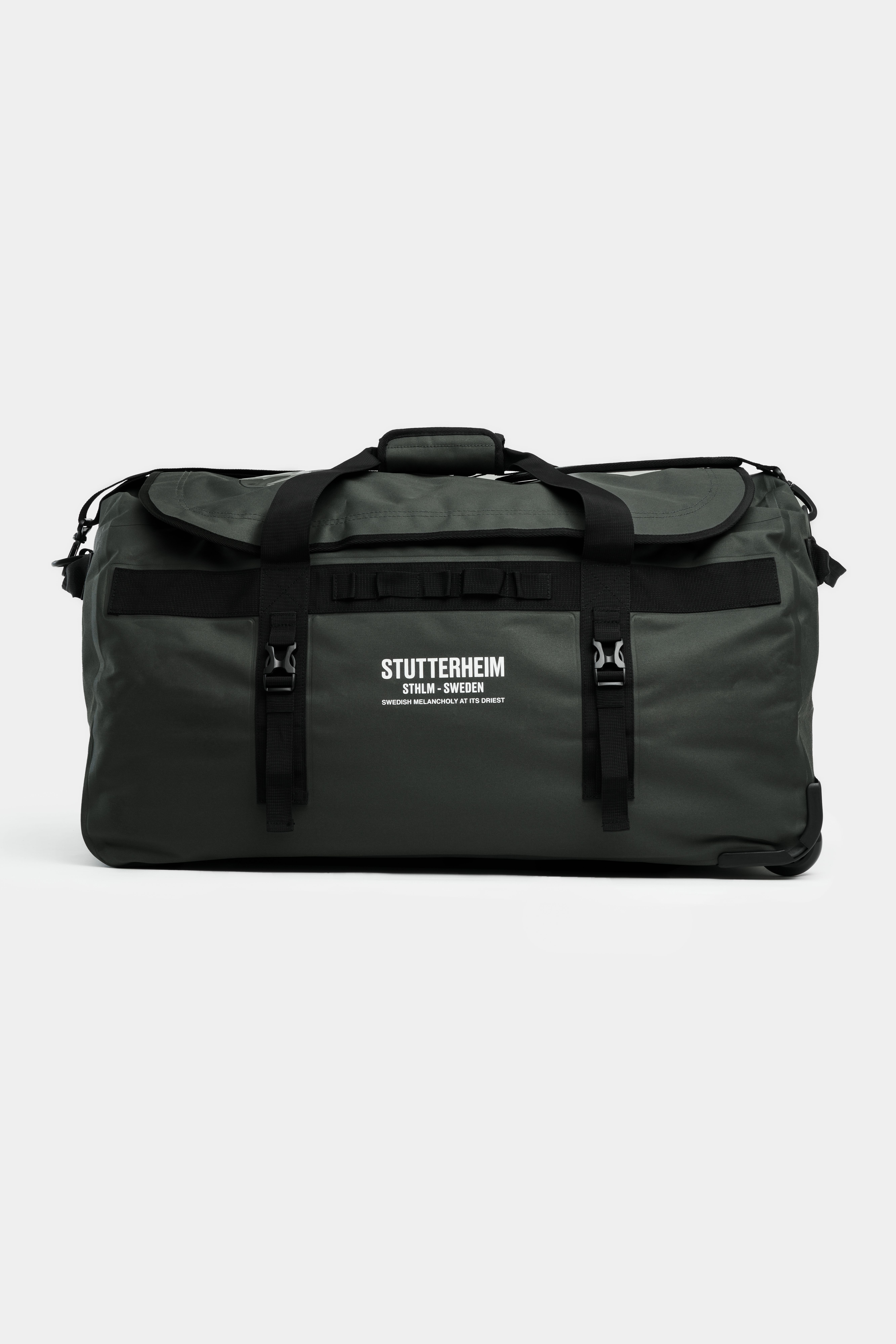 Rain Trolley is a large waterproof suitcase that can be used as a wheelie bag or as a duffel bag. Equipped with wheels and a telescopic handle as well as an adjustable crossbody strap, it is possible to alternate between ways of carrying and adjust according to the weight of the load. An inner mesh pocket, as well as a compartment on the top lid, allows for clever packing while the generous size of the main compartment leaves enough room even for the heaviest of packers – this is the ultimate suitcase. GARMENT DETAILS • Completely waterproof • Telescopic handle • Wheels • Adjustable crossbody strap • Top handle • Inner mesh compartment • Zipped top lid compartment • 8000 mm water column pressure • Designed in Stockholm • Height: 40 cm / 15" • Length: 70 cm / 27" • Width 37 cm / 14" • Capacity: 115 litres / 30 gallons MATERIAL 87% PVC and 13% polyester Read more about our fabrics