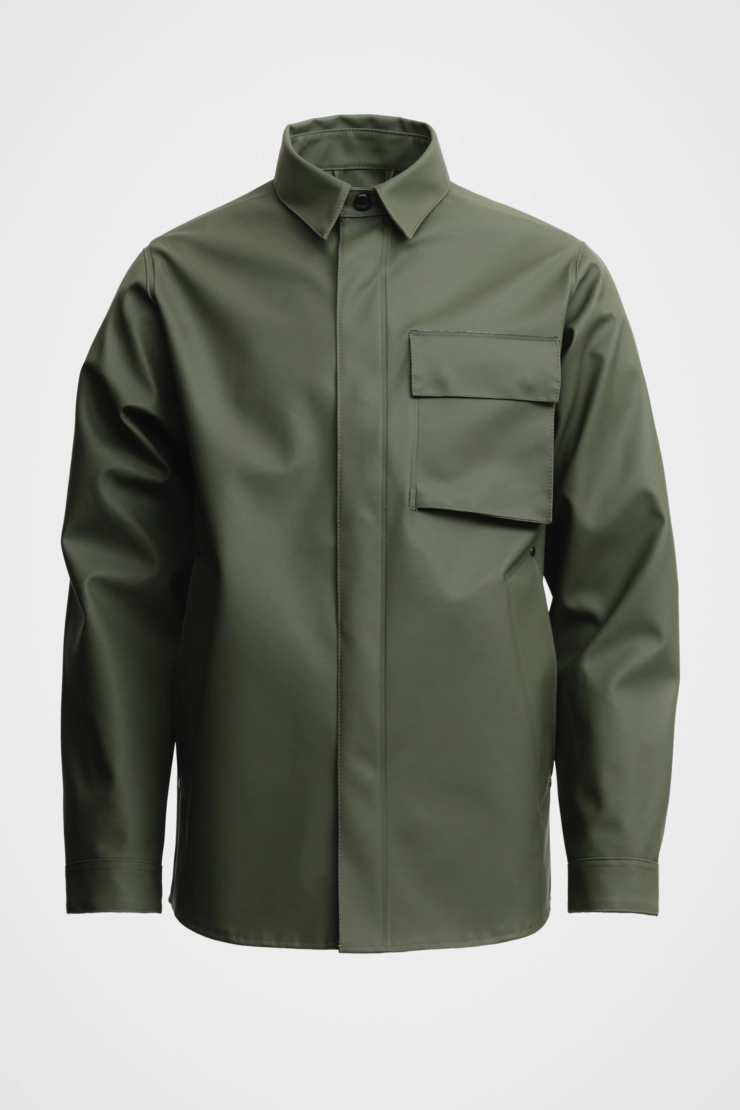 Ringen is an overshirt for men in light yet sturdy waterproof fabric. Tailored with double-welded seams, this relaxed-fitting jacket is completely weather-secure, keeping both wind and wet out. An ideal trans-seasonal garment, it's just the thing needed in unexpected spring showers or autumn drizzles. The model is 184 cm / 6' 0" Wearing → SIZE M GARMENT DETAILS • Midweight 280-gram fabric • Completely waterproof • Regular fit • Hidden snap metal buttons on front • Welt pocket at chest • Open side pockets • Classic shirt sleeve cuffs • Debossed logo on collar • +20 000 mm water column pressure • Designed in Stockholm • Made in Europe MATERIAL Coating: 100% PVC rubberized coating Membrane: 100% polyester Read more about our fabrics