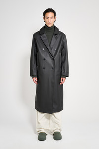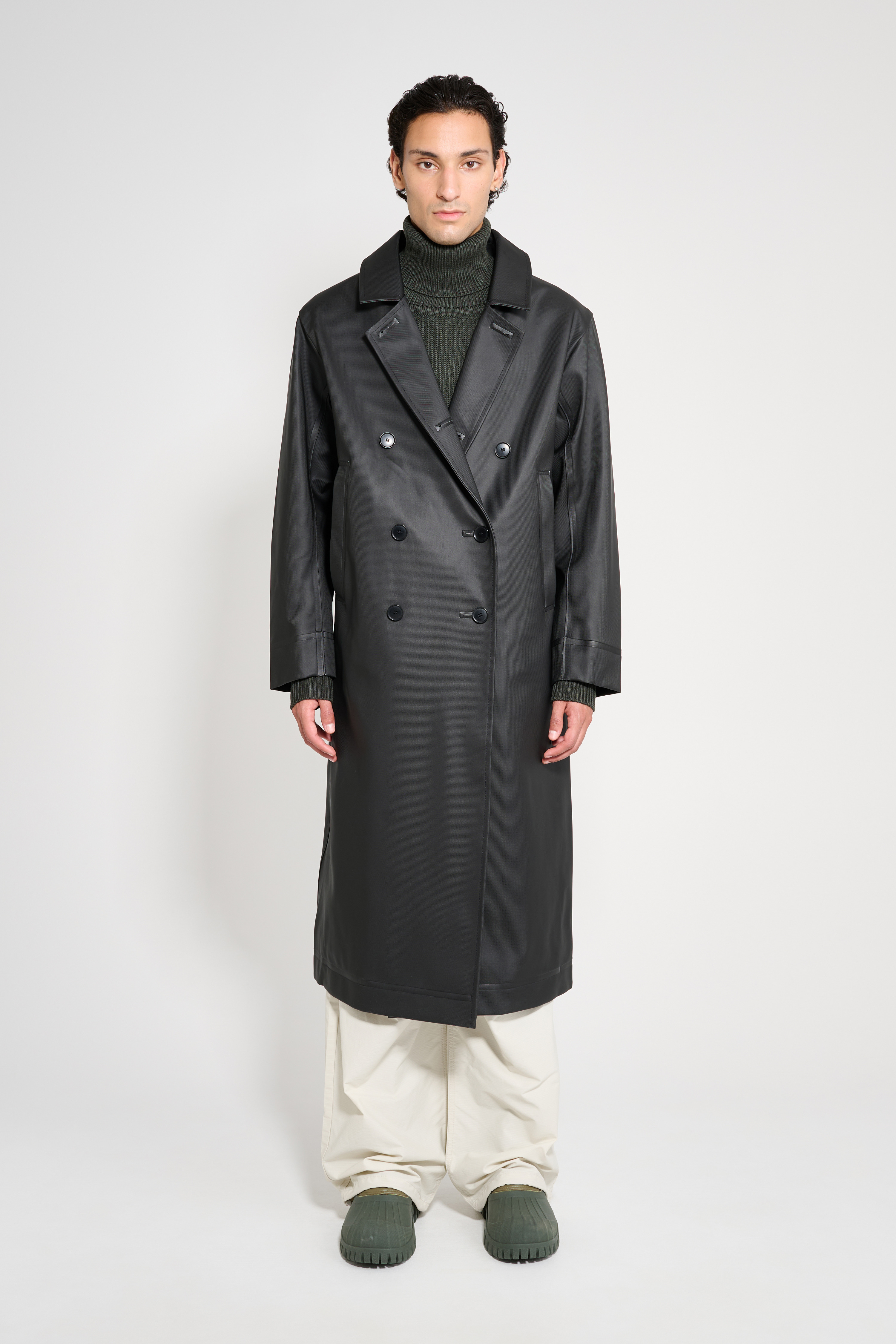 Rosenbad is a long double-breasted overcoat for men. This timeless style is given a fresh take in sturdy and hard-wearing waterproof fabric with a canvas-textured finish. Tailored with double-welded seams, it's completely resistant to wet weather. This regular-fit raincoat has side pockets and broad lapels that can be turned up for extra protection around the neck. GARMENT DETAILS • Heavy midweight 380-gram fabric • Completely waterproof • Canvas-textured fabric finish • Double-breasted • Full-length • Regular fit • Acrylic buttons • Side pockets • Debossed logo at back collar • Double-welded seams • +20 000 mm water column pressure • Designed in Stockholm • Made in Europe MATERIAL Coating: 100% PVC rubberized coating Membrane: 52% Cotton, 48% polyester Read more about our fabrics