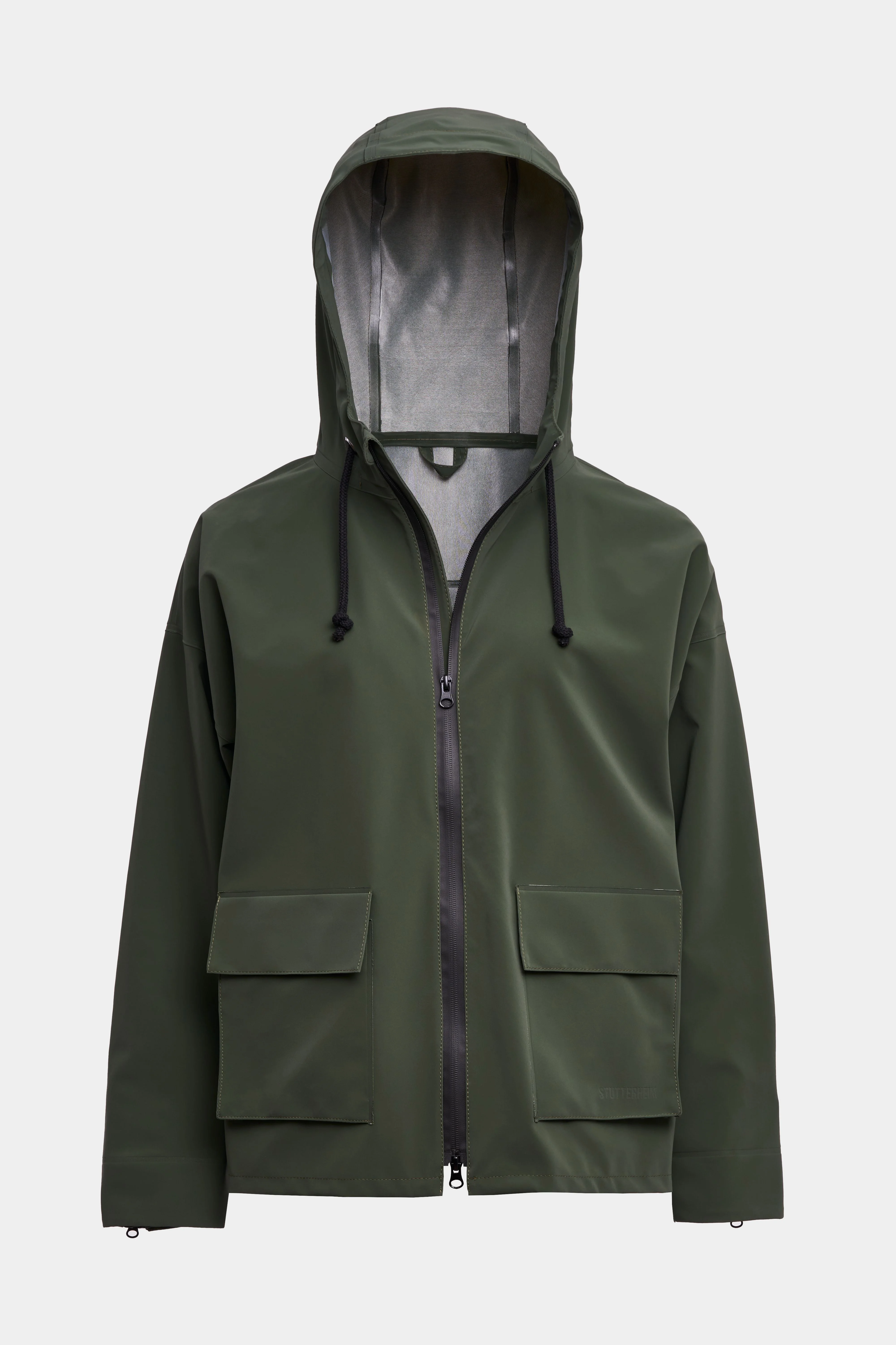 Sandviken is a short rain jacket for women in light and airy waterproof fabric with a matte finish. Expertly crafted, it’s tailored with double-welded seams and equipped with an aqua guard zipper for complete protection against the rain. The deep inverted box pleat in the back of the jacket gives it an elegant silhouette and relaxed fit, while the drawstring hood with chunky cotton hood laces and the front patch pockets act as both practical features and fashionable detailing. The model is 178 cm / 5′ 10″ Wearing → SIZE S GARMENT DETAILS • Lightweight 230-gram fabric • Matte-textured finish • Completely waterproof • Hip-length • Deep inverted box pleat in back • Drawstring hood with chunky cotton laces • Aqua guard zipper • Aqua guard sleeve zippers • Patch pockets with flap • Double-welded seams • Under-arm eyelets for ventilation • +20 000 mm water column pressure • Designed in Stockholm • Made in Europe MATERIAL Coating: 100% PVC rubberized coating Membrane: 100% polyester Read more about our fabrics