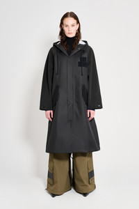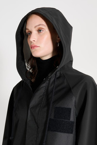 Stadshagen is a long fishtail parka for women. This two-tone, two-texture design has taped inside seams, making it resistant to wind and rain. The body of the garment is made up of a breathable nylon fabric, while the sleeves and hood are made in our classic sturdy and hard-wearing waterproof fabric with a matte finish. With tapered sleeves and a relaxed silhouette, this style strikes a balance between effortless elegance and laid-back appeal – delivering standout style without sacrificing functionality. GARMENT DETAILS - Heavyweight 530-gram fabric (sleeves and collar) - Breathable woven nylon fabric (body) - Wind and water-resistant - Taped inside seams - Relaxed fit - Calf-length - Adjustable drawstring fishtail back detail - Drawstring hood with chunky cotton strings - Raglan sleeve construction - Hidden button front fastening - Slanted side pockets with flaps and snap button closure - Velcro patch on the chest - Designed in Stockholm - Made in Europe MATERIAL Sleeves & collar: Coating: 100% PVC rubberized coating Membrane 52% cotton, 48% polyester Read more about our fabrics