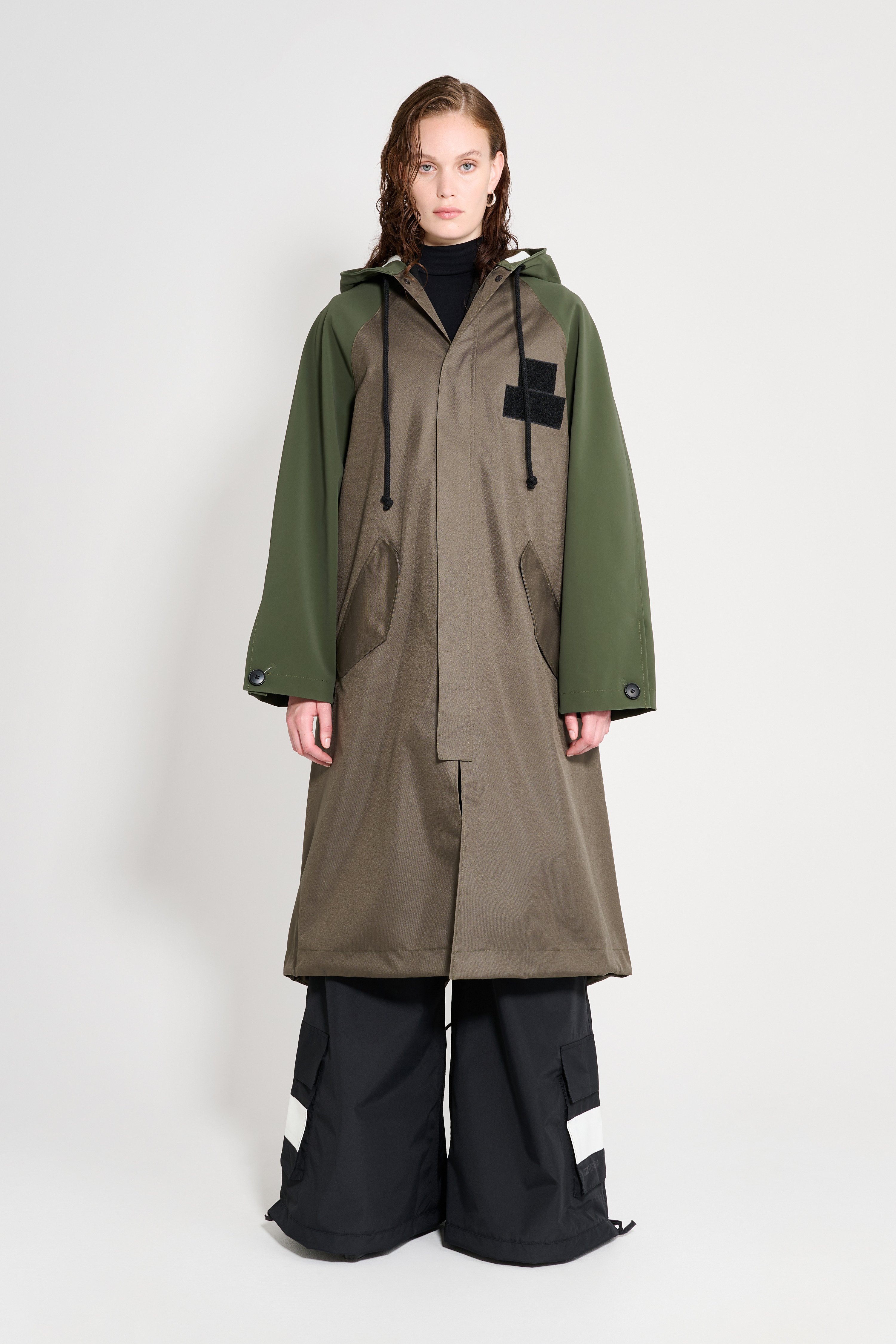 Stadshagen is a long fishtail parka for women. This two-tone, two-texture design has taped inside seams, making it resistant to wind and rain. The body of the garment is made up of a breathable nylon fabric, while the sleeves and hood are made in our classic sturdy and hard-wearing waterproof fabric with a matte finish. With tapered sleeves and a relaxed silhouette, this style strikes a balance between effortless elegance and laid-back appeal – delivering standout style without sacrificing functionality. GARMENT DETAILS • Heavyweight 530-gram fabric (sleeves and collar) • Breathable woven nylon fabric (body) • Wind and water-resistant • Taped inside seams • Relaxed fit • Calf-length • Adjustable drawstring fishtail back detail • Drawstring hood with chunky cotton strings • Raglan sleeve construction • Hidden button front fastening • Slanted side pockets with flaps and snap button closure • Velcro patch on the chest • Designed in Stockholm • Made in Europe MATERIAL Sleeves & collar: Coating: 100% PVC rubberized coating Membrane 52% cotton, 48% polyester Read more about our fabrics