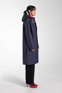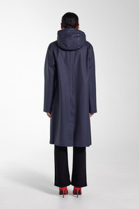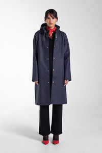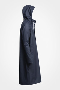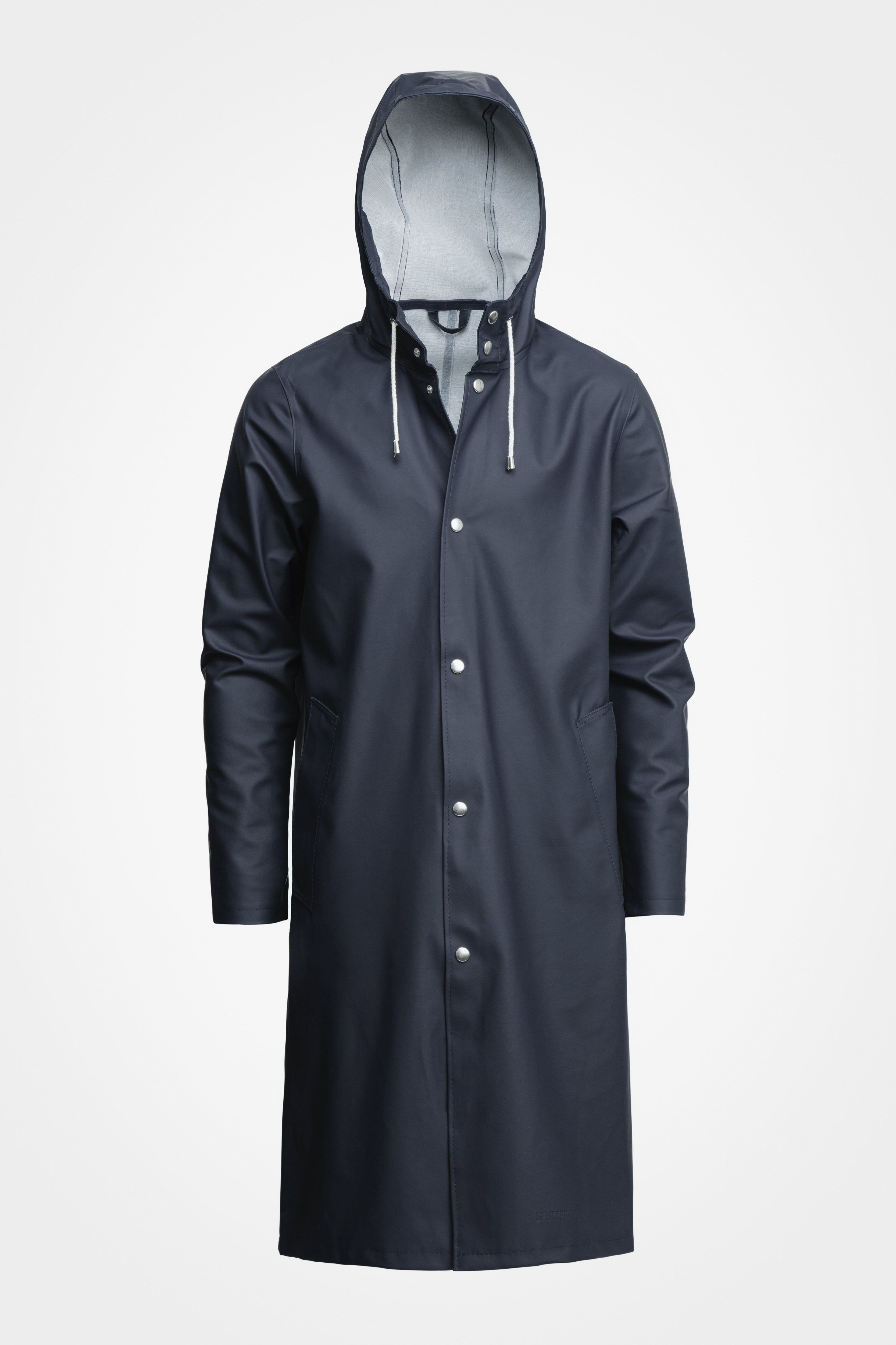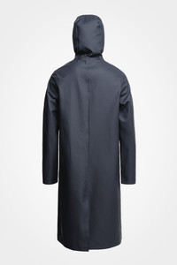 Stockholm Long is a straight-fit knee-length raincoat in sturdy and hard-wearing waterproof fabric. Expertly made, it’s tailored with double-welded seams for complete protection against the rain. The drawstring hood and under-arm eyelets add ease of movement and comfort in uncomfortable weather. The model is 175 cm / 5′ 9” Wearing → SIZE XS GARMENT DETAILS • Mid-weight 380-gram fabric • Completely waterproof • Straight unisex fit • Knee-length • Snap metal button closures • Drawstring hood • Open welt pockets • Double welded seams • Under-arm eyelets for ventilation • +20 000 mm water column pressure • Designed in Stockholm • Made in Europe MATERIAL Coating: 100% PVC rubberized coating Membrane: 52% cotton, 48% polyester Read more about our fabrics