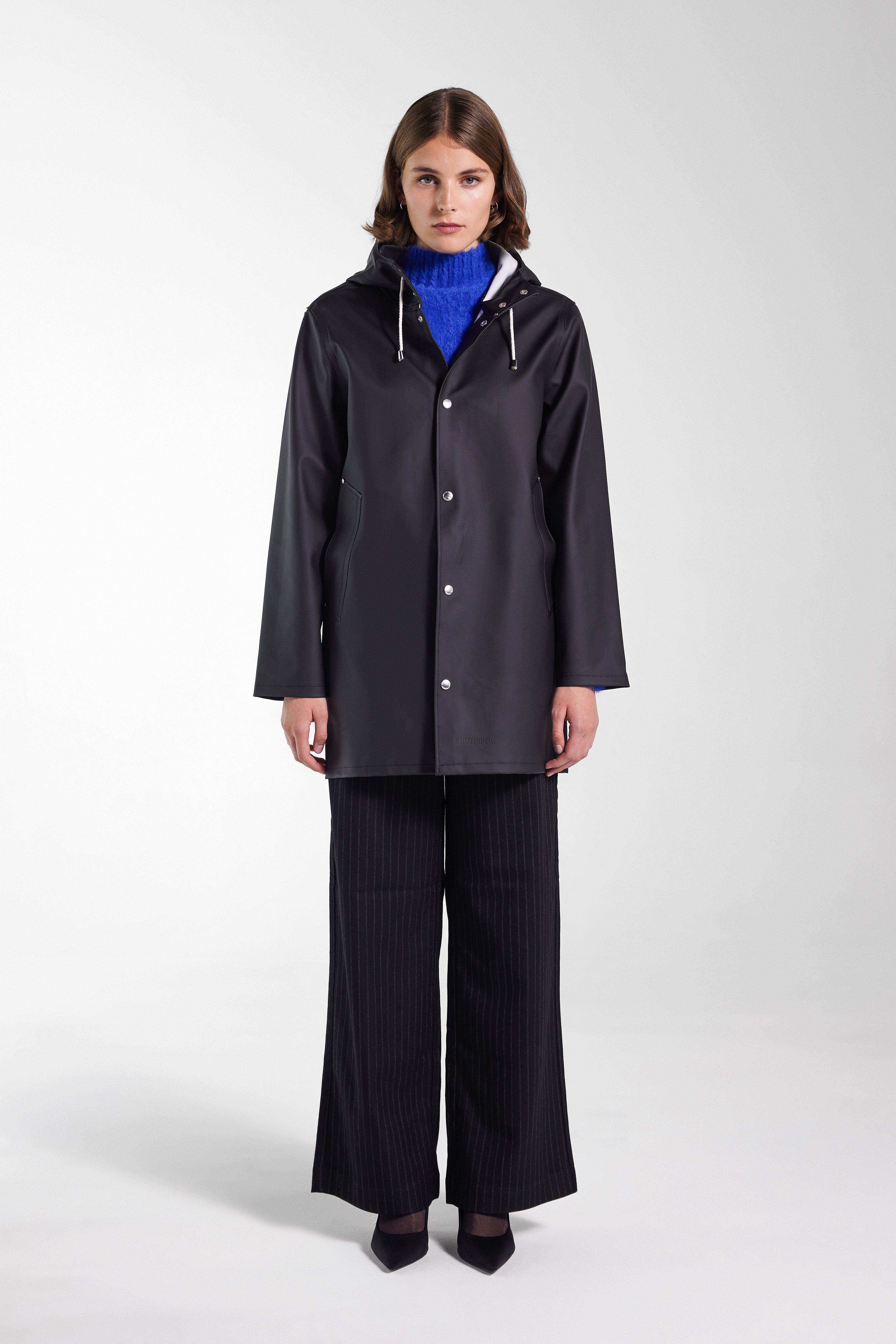 Stockholm, our home and your essential wardrobe staple is a straight-fit raincoat in sturdy and hard-wearing waterproof fabric. Expertly made, it’s tailored with double-welded seams for complete protection against the rain. The drawstring hood and under-arm eyelets add ease of movement and comfort in uncomfortable weather. The model is 179 cm / 5′ 10″ Wearing → SIZE XS GARMENT DETAILS • Heavy-weight 530-gram fabric weight • Completely waterproof • Straight unisex fit • Snap metal button closures • Drawstring hood • Open welt pockets • Double welded seams • Under-arm eyelets for ventilation • +20 000 mm water column pressure • Designed in Stockholm • Made in Europe MATERIAL Coating: 100% PVC rubberized coating Membrane: 52% cotton, 48% polyester Read more about our fabrics
