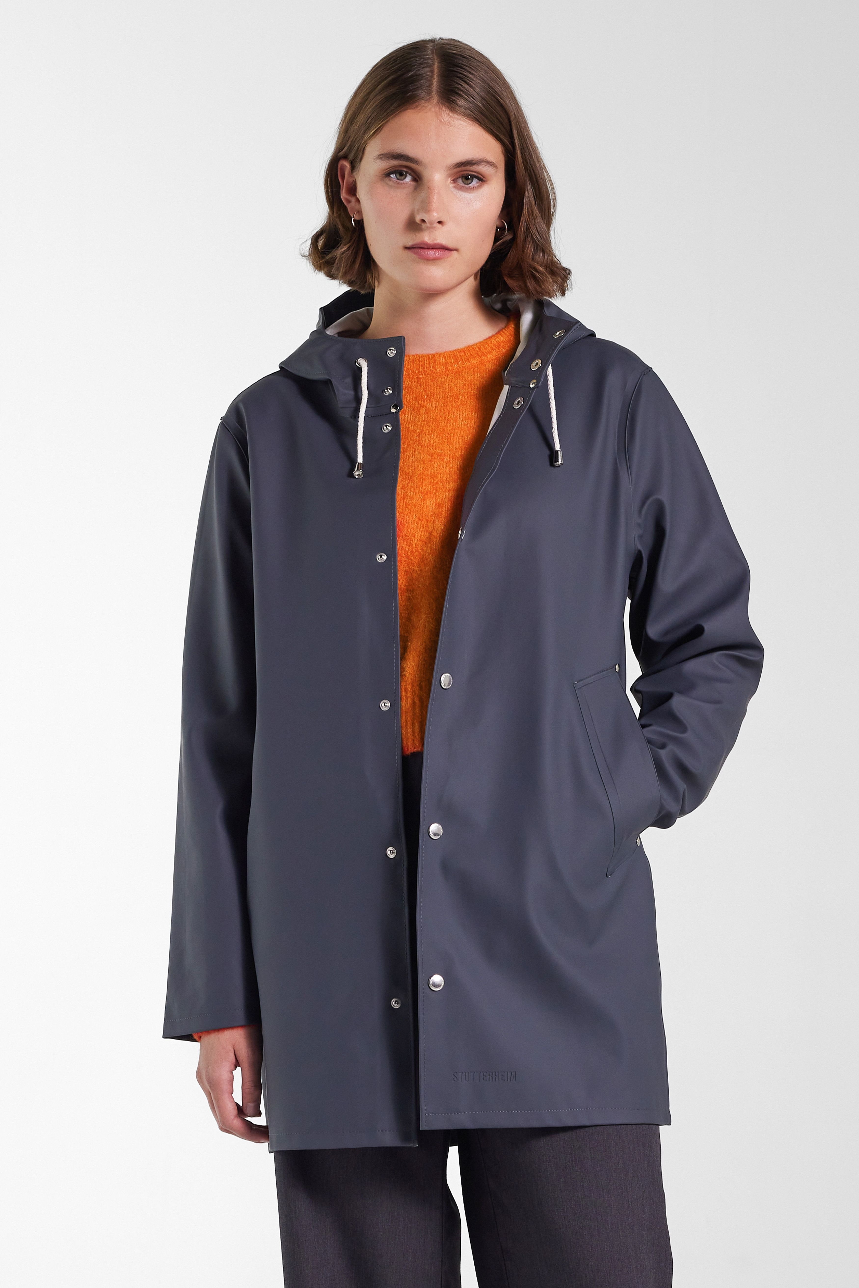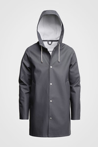 Stockholm, our home and your essential wardrobe staple is a straight-fit raincoat in sturdy and hard-wearing waterproof fabric. Expertly made, it’s tailored with double-welded seams for complete protection against the rain. The drawstring hood and under-arm eyelets add ease of movement and comfort in uncomfortable weather. The model is 179 cm / 5′ 10″ Wearing → SIZE XS GARMENT DETAILS • Heavy-weight 530-gram fabric weight • Completely waterproof • Straight unisex fit • Snap metal button closures • Drawstring hood • Open welt pockets • Double welded seams • Under-arm eyelets for ventilation • +20 000 mm water column pressure • Designed in Stockholm • Made in Europe MATERIAL Coating: 100% PVC rubberized coating Membrane: 52% cotton, 48% polyester Read more about our fabrics