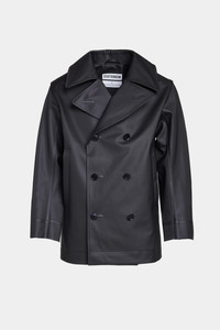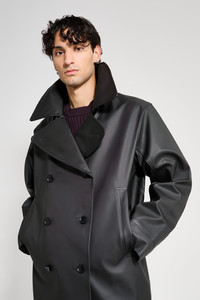 Tranholmen is a classically cut double-breasted pea coat for men. This timeless style is given a fresh take in sturdy and hard-wearing waterproof fabric with a canvas-textured finish. Tailored with double-welded seams, it's completely resistant to wet weather. This regular-fit raincoat has side pockets and broad lapels that can be turned up for extra protection around the neck. The model is 183 cm / 6'0 Wearing → SIZE M GARMENT DETAILS - Heavy midweight 380-gram fabric - Completely waterproof - Canvas-textured fabric finish - Double-breasted - Hip-length - Regular fit - Acrylic buttons - Side pockets - Debossed logo at back collar - Double-welded seams - +20 000 mm water column pressure - Designed in Stockholm - Made in Europe MATERIAL Coating: 100% PVC rubberized coating Membrane: 52% Cotton, 48% polyester Read more about our fabrics