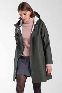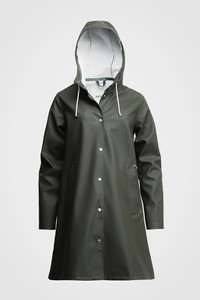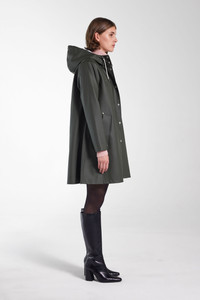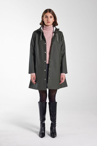 Mosebacke, a hilltop overlooking Stockholm and your top wardrobe staple, is an artisanally made a-line-shaped raincoat for women. The sturdy and hard-wearing waterproof fabric is tailored with double-welded seams, making it impossible for any moisture to seep through. Ease of movement and comfort is achieved with under-arm eyelets and a drawstring hood. The model is 179 cm / 5′ 10″ Wearing → SIZE S GARMENT DETAILS • Heavy-weight 530-gram fabric • Completely waterproof • A-line silhouette • Snap metal button closures • Drawstring hood • Open welt pockets • Double welded seams • Under-arm eyelets for ventilation • +20 000 mm water column pressure • Designed in Stockholm • Made in Europe MATERIAL Coating: 100% PVC rubberized coating Membrane: 52% cotton, 48% polyester Read more about our fabrics