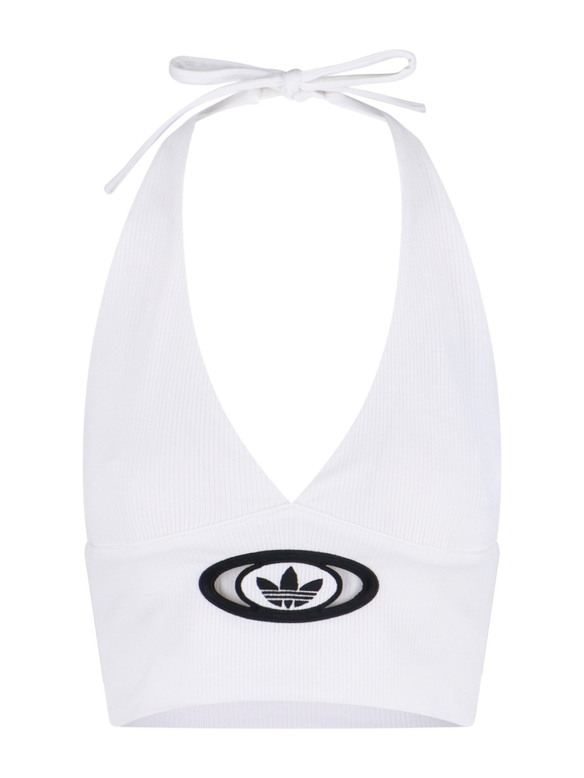 CAMPUS 2000 ADIDAS VISCOSE AND WHITE COTTON CROPPED TOP WITH RIBBED PATTERN, V-NECK, THIN STRAPS, CONTRAST "TREFOIL" LOGO EMBROIDERY AT THE FRONT, CUT-OUT DETAIL, DEEP NECKLINE AT THE BACK, LACE-UP CLOSURE AT THE BACK, STRAIGHT HEM. PRODUCT INFO PRODUCT CODE KC8801WHITE COMPOSITION: 47% VISCOSE, 43% COTTON, 10% ELASTANE SIZE AND FIT: REGULAR FIT MADE IN: CHINA