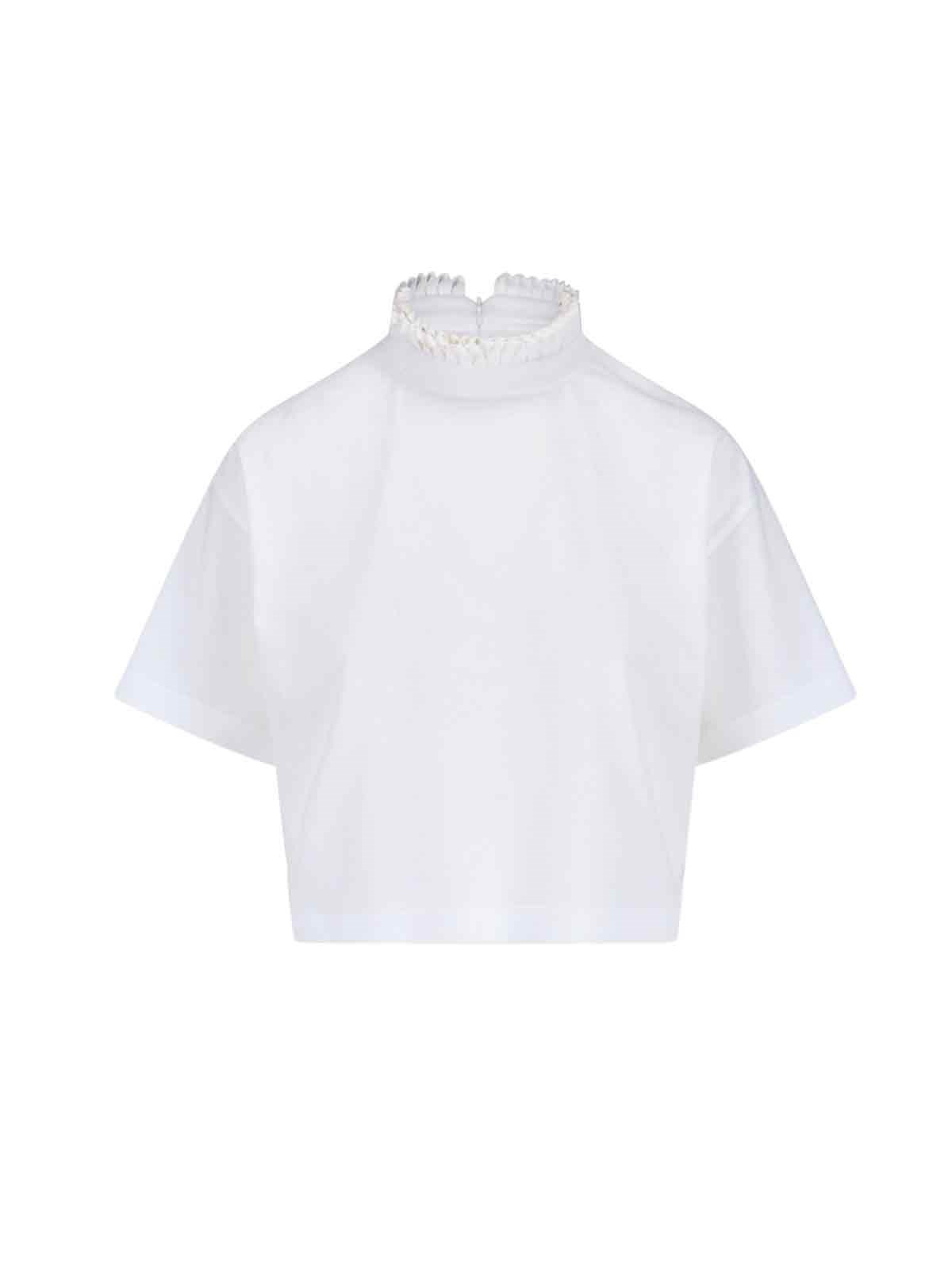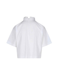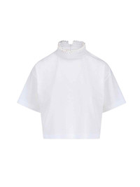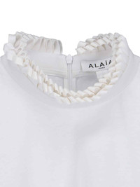 ALAIA CROPPED T-SHIRT IN WHITE COTTON WITH PLEATED DETAIL HIGH NECK, BACK ZIP CLOSURE, SHORT SLEEVES, STRAIGHT HEM. PRODUCT INFO PRODUCT CODE AA9I0009J010B000 COMPOSITION: 100% COTTON SIZE AND FIT: CROPPED FIT MADE IN: ITALY