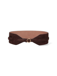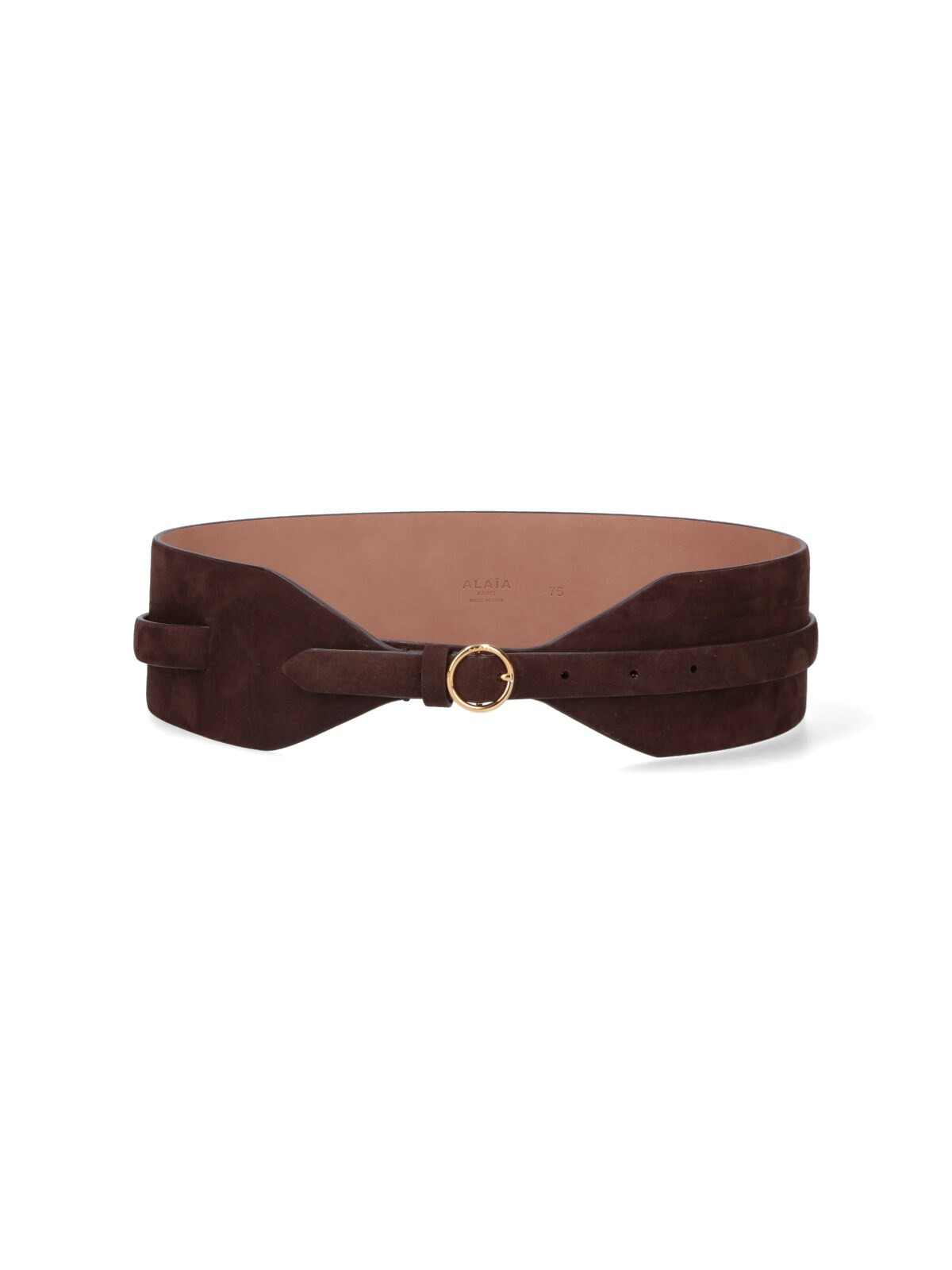 ALAIA DOUBLE WIDE BELT IN BROWN CALF SUEDE WITH GOLD METAL LOGO BUCKLE ON THE FRONT, ADJUSTABLE. PRODUCT INFO PRODUCT CODE AA1C331MCA214733 COMPOSITION: 100% CALF LEATHER SIZE AND FIT: HEIGHT 6 CM MADE IN: ITALY