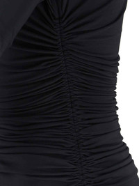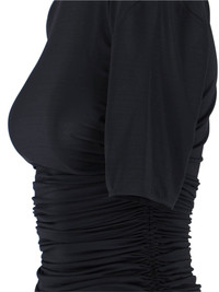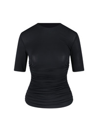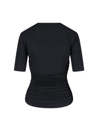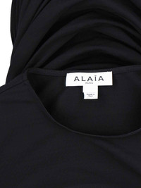 DRAPED T-SHIRT IN BLACK ALAIA VISCOSE WITH CREWNECK, THREE-QUARTER SLEEVES, DRAPED DETAILS AT THE WAIST, AND STRAIGHT HEM. PRODUCT INFO PRODUCT CODE AA9H1248J050B995 COMPOSITION: 96% VISCOSE, 4% ELASTANE SIZE AND FIT: SLIM FIT MADE IN: ITALY