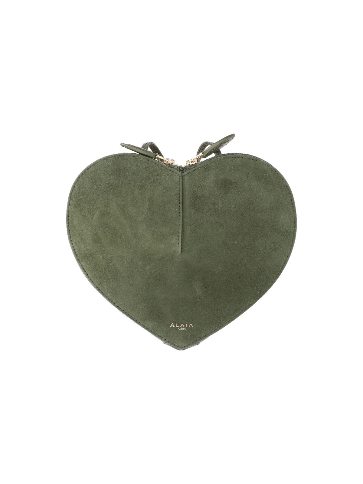 ALAIA "LE CŒUR" CROSSBODY BAG IN GREEN LEATHER, SUEDE ON ONE SIDE, HAMMERED ON THE OTHER, HEART-SHAPED DESIGN, ADJUSTABLE AND REMOVABLE SHOULDER STRAP, DOUBLE ZIP CLOSURE, SILVER LOGO EMBOSSED ON THE FRONT, A SINGLE INNER COMPARTMENT. PRODUCT INFO PRODUCT CODE AA1P003CA577643 COMPOSITION: 100% CALF LEATHER SIZE AND FIT: H 17 X W 21 X D 5 CM MADE IN: ITALY