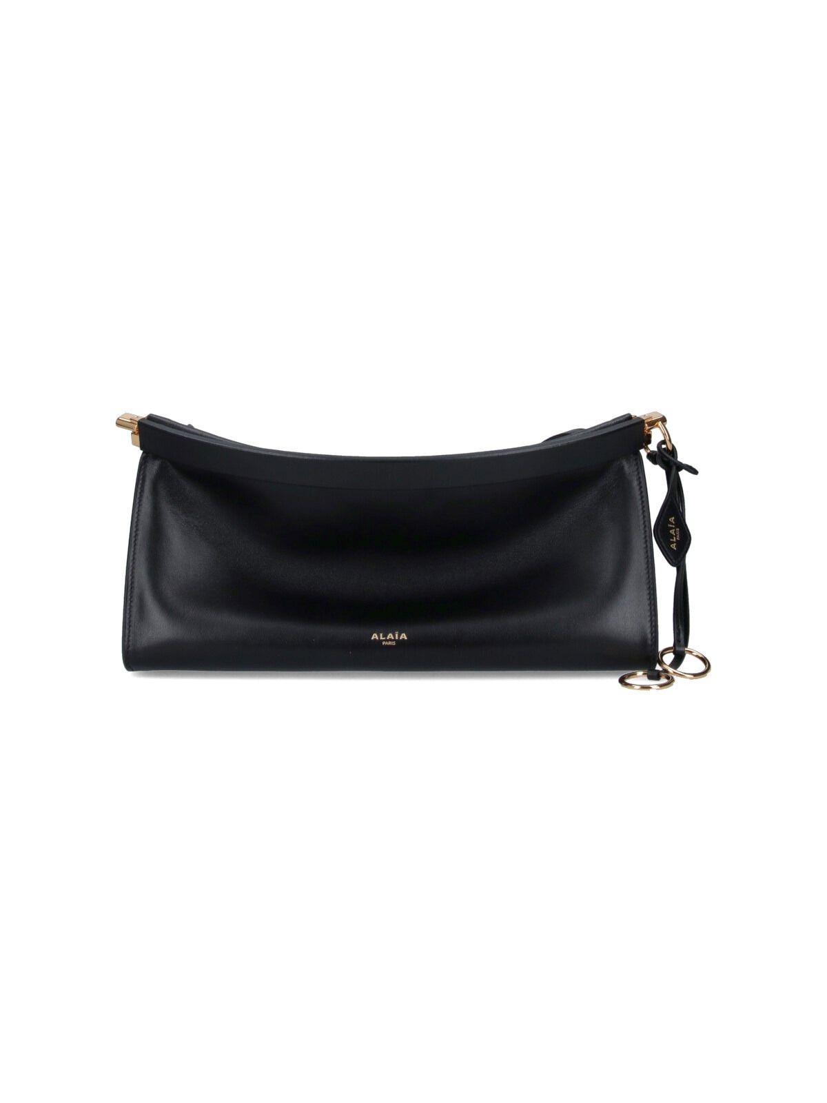ALAIA LE CLICK EAST WEST MEDIUM SHOULDER BAG IN BLACK LEATHER WITH ADJUSTABLE AND REMOVABLE SHOULDER STRAP, GUSSET CLOSURE, GOLD LOGO PRINT ON THE FRONT, REMOVABLE DECORATIVE LACES WITH GOLD METAL RING ON THE SIDE, NAMEPLATE DETAIL WITH GOLD LOGO PRINT, ONE SINGLE INNER COMPARTMENT. PRODUCT INFO PRODUCT CODE AA1S01430CA332999 COMPOSITION: 100% CALF LEATHER SIZE AND FIT: H 14 X W 30 X D 9 CM MADE IN: ITALY