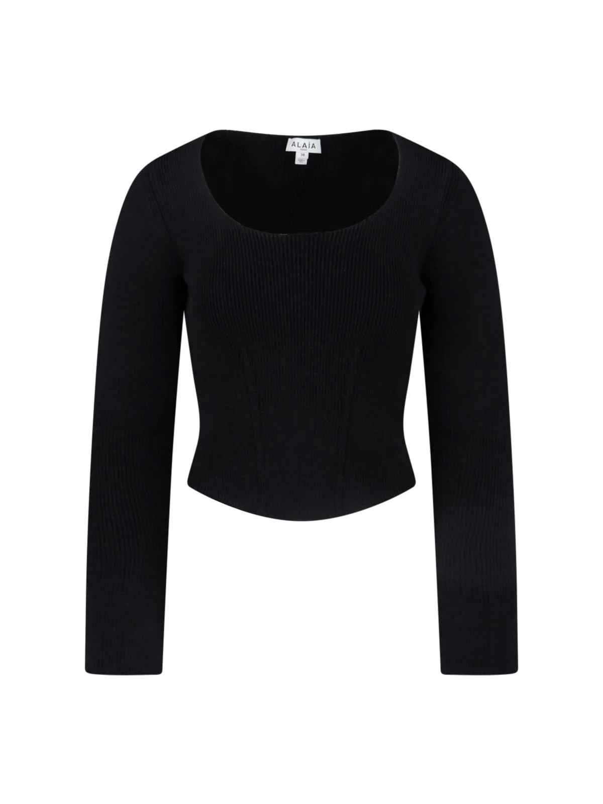 ALAIA CORSET BLACK WOOL TOP WITH RIBBED KNIT, WIDE NECKLINE, LONG SLEEVES, INTEGRATED SPLINTING, CURVED HEM. PRODUCT INFO PRODUCT CODE AA9H1399K141C995 COMPOSITION: 92% WOOL, 7% POLYAMIDE SIZE AND FIT: SLIM FIT MADE IN: ITALY