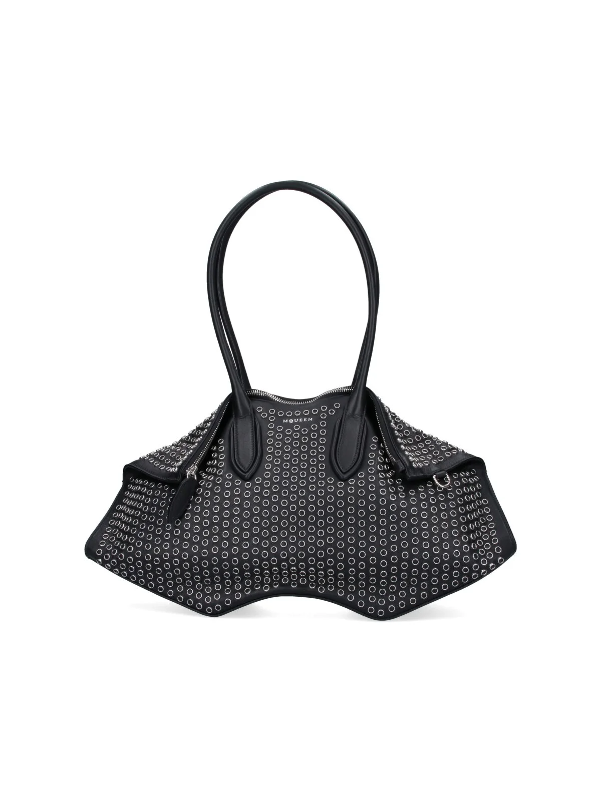 ALEXANDER MCQUEEN MANTA SHOULDER BAG IN BLACK CALF NAPPA LEATHER WITH TWO TOP LEATHER HANDLES, ALL-OVER STUDS DETAILS, ZIP CLOSURE, SILVER METAL LOGO ON THE FRONT, INNER POCKET, AND SINGLE INNER COMPARTMENT. PRODUCT INFO PRODUCT CODE 855997 1VDXC1000 COMPOSITION: 100% CALF LEATHER SIZE AND FIT: H 22 X W 43 X D 11.5 CM MADE IN: ITALY