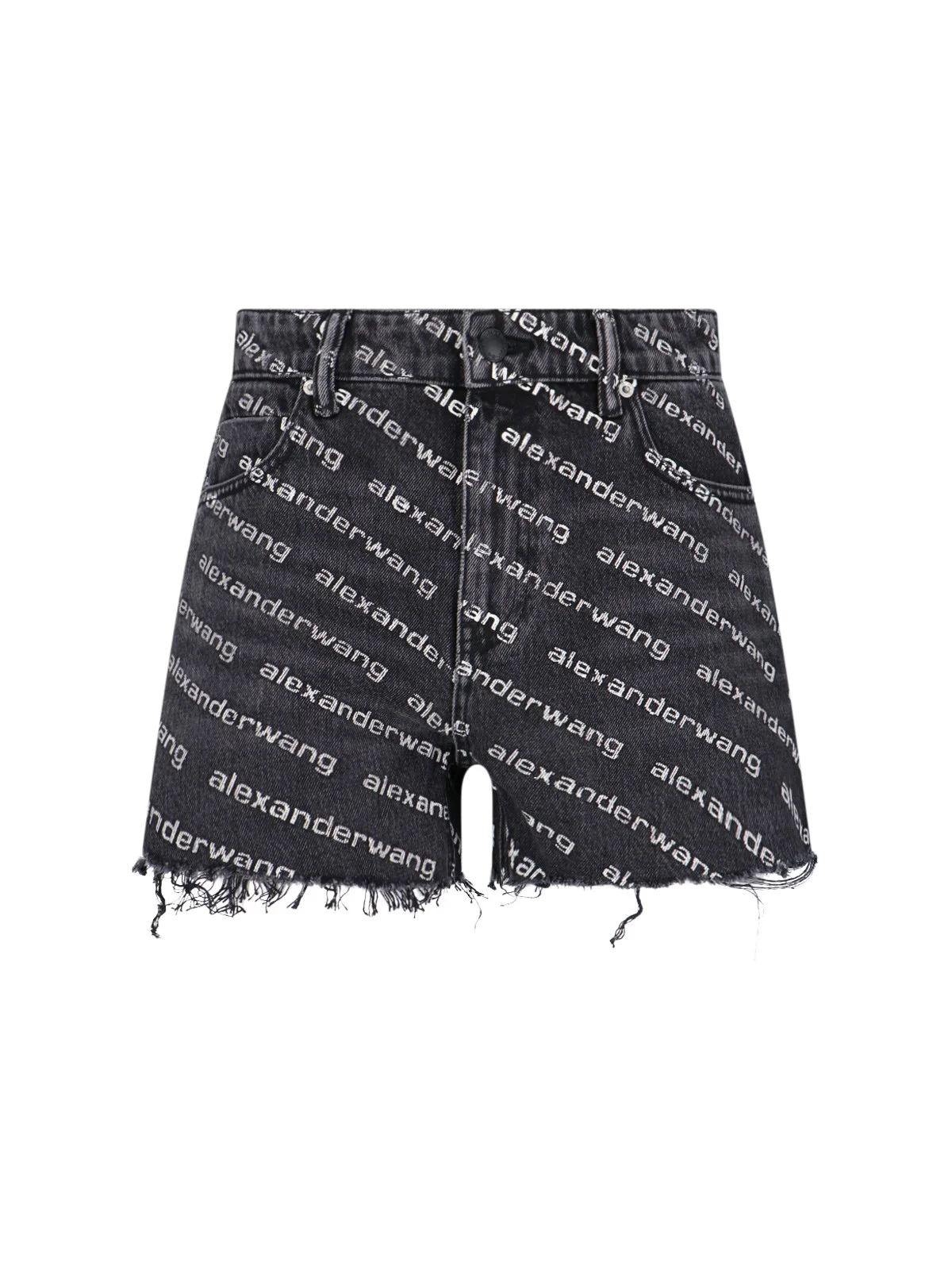 ALEXANDER WANG LOGO SHORTS IN DARK GRAY DENIM WITH DISTRESSED WASH, ALL-OVER WHITE LOGO PRINT PATTERN, MID WAIST, BELT LOOPS, ZIP AND BUTTON CLOSURE, FIVE POCKETS, TONE-ON-TONE LOGO PATCH ON THE BACK, AND FRINGE-EFFECT DESTROYED DETAILS ON THE BOTTOM. PRODUCT INFO PRODUCT CODE 4DC1214896060 COMPOSITION: 100% COTTON SIZE AND FIT: REGULAR FIT MADE IN: CHINA - DENIM SIZE SCALE