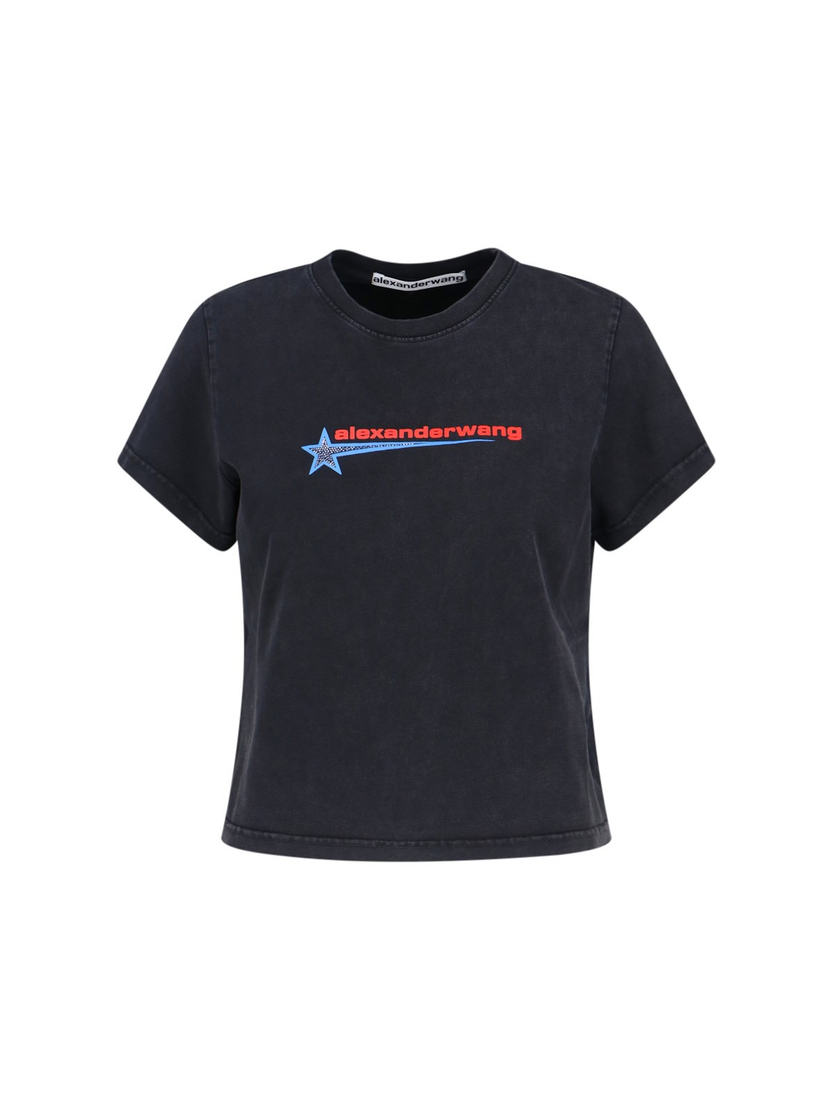 ALEXANDER WANG SHRUNKEN T-SHIRT IN BLACK COTTON WITH ROUND NECKLINE, SHORT SLEEVES, MULTICOLOR LOGO PRINT ON THE FRONT, RHINESTONE DETAIL, AND STRAIGHT HEM. PRODUCT INFO PRODUCT CODE 1CC4251155011 COMPOSITION: 100% COTTON SIZE AND FIT: CROPPED FIT MADE IN: PORTUGAL