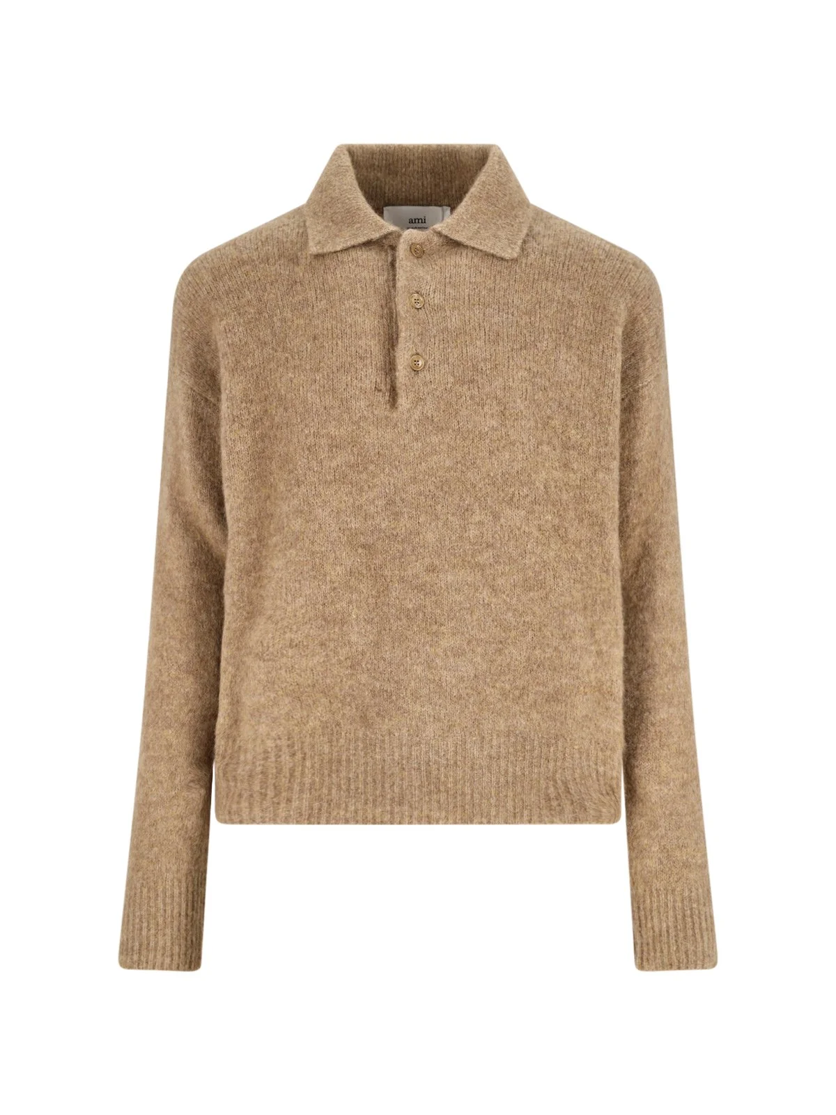AMI BROWN ALPACA BLEND POLO SHIRT WITH CLASSIC COLLAR, BUTTON CLOSURE, DROPPED SHOULDERS, RIBBED TRIM, STRAIGHT HEM. PRODUCT INFO PRODUCT CODE HPL405 KN0021280 COMPOSITION: 42% ALPACA, 40% WOOL, 16% POLYAMIDE, 2% ELASTANE SIZE AND FIT: SOFT FIT MADE IN: ITALY