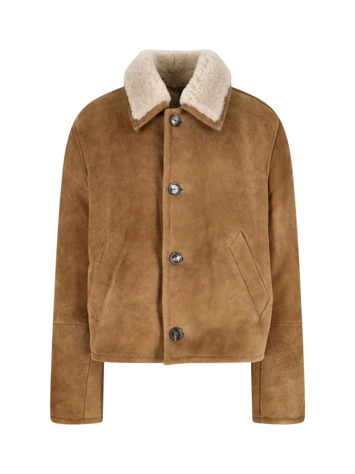 AMI SHEARLING JACKET IN BROWN SHEEPSKIN WITH CLASSIC COLLAR, CONTRAST BUTTON CLOSURE, DROPPED SHOULDERS, TWO FRONT WELT POCKETS, SHEARLING TRIM AND LINING, AND STRAIGHT HEM. PRODUCT INFO PRODUCT CODE UJK837 LH0057280 COMPOSITION: 100% SHEEP LEATHER SIZE AND FIT: REGULAR FIT MADE IN: TURKEY