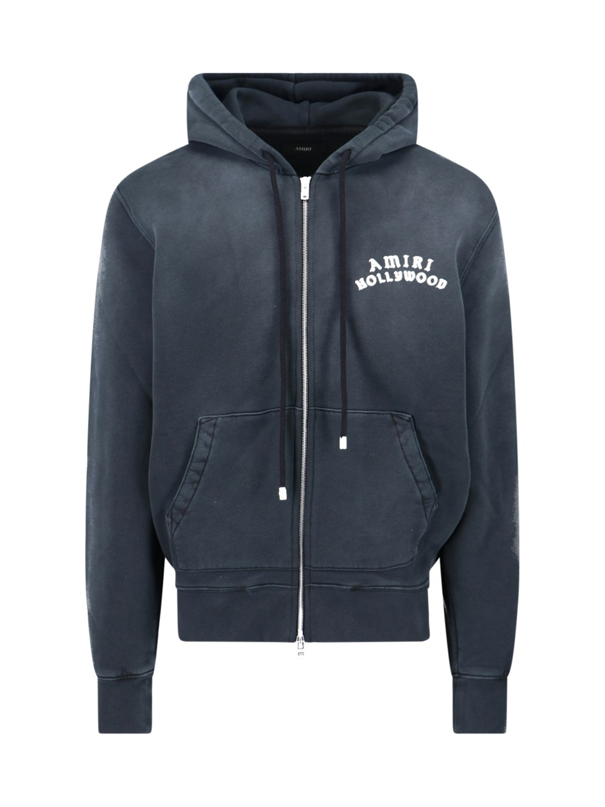 AMIRI 'HOLLYWOOD' LOGO SWEATSHIRT IN BLACK COTTON WITH DISTRESSED WASH, HOODED DESIGN, DRAWSTRING, ZIP CLOSURE, CONTRAST CHEST LOGO PRINT, MAXI FRONT POCKET, MAXI LOGO PRINT ON THE BACK, ELASTICATED CUFFS AND WAIST, STRAIGHT HEM. PRODUCT INFO PRODUCT CODE AMJYHD1132BLACK COMPOSITION: 100% COTTON SIZE AND FIT: REGULAR FIT MADE IN: ITALY