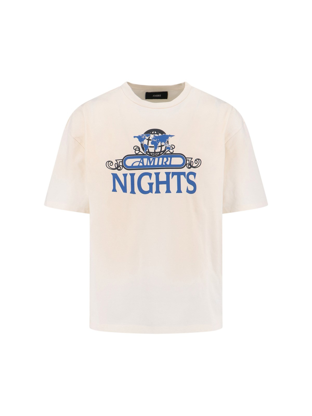 AMIRI 'NIGHTS' LOGO T-SHIRT IN CREAM COTTON WITH DISTRESSED WASH, CREW NECK, RIBBED TRIMS, DROPPED SHOULDERS, SHORT SLEEVES, CONTRAST MAXI LOGO PRINT ON THE FRONT AND BACK, STRAIGHT HEM. PRODUCT INFO PRODUCT CODE AMJYTE1207IVORY COMPOSITION: 100% COTTON SIZE AND FIT: OVERSIZED FIT MADE IN: ITALY