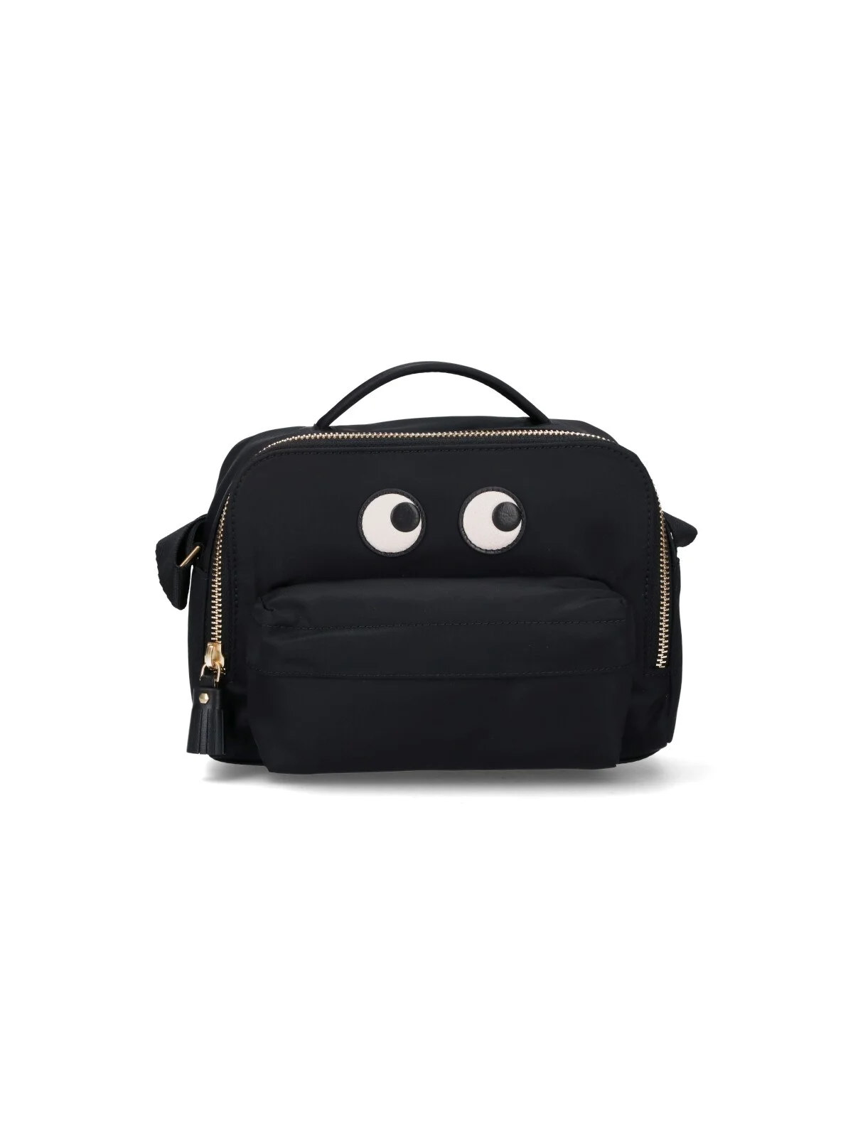 ANYA HINDMARCH 'EYES' SHOULDER BAG IN BLACK FABRIC WITH TOP HANDLE, ADJUSTABLE SHOULDER STRAP, ZIP CLOSURE, CONTRAST 'EYES' DETAIL ON THE FRONT, FRONT POCKET, MAIN INNER COMPARTMENT. PRODUCT INFO PRODUCT CODE 193542BLACK COMPOSITION: 100% ECONYL SIZE AND FIT: H 15 X W 22 X D 7 CM MADE IN: CHINA - STRAP SPAN: 117 CM - PRODUCT MADE FROM RECYCLED MATERIALS