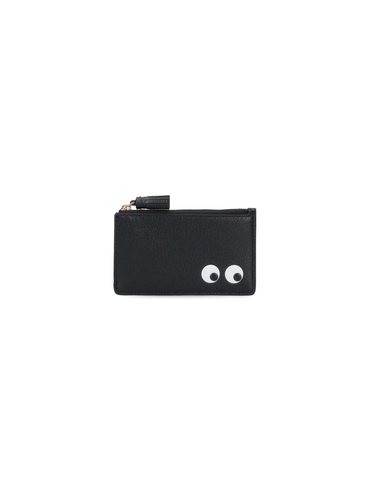 ANYA HINDMARCH 'EYES' ZIP CARD HOLDER IN BLACK GOAT LEATHER WITH ZIP CLOSURE, ZIP PULL, CONTRAST 'EYES' DETAIL ON THE FRONT, FOUR CARD SLOTS, ONE MAIN POCKET, GOLD EMBOSSED DETAIL ON THE BACK. PRODUCT INFO PRODUCT CODE 142717BLACK COMPOSITION: 100% GOAT LEATHER SIZE AND FIT: H 13 X L 8 CM MADE IN: CHINA