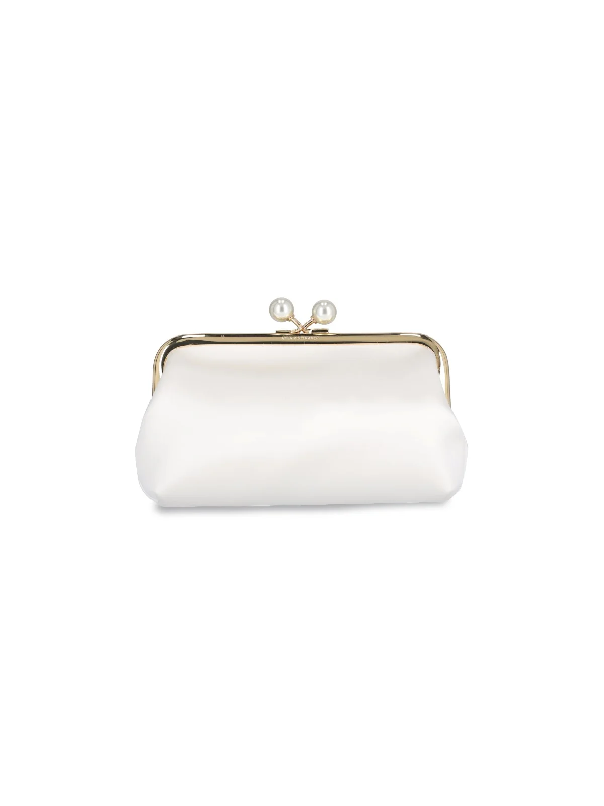 PERLS MAUD' ANYA HINDMARCH POUCH IN WHITE RECYCLED SATIN, WITH GOLD METAL HOOK CLOSURE, REMOVABLE GOLD METAL CHAIN SHOULDER STRAP, EMBOSSED LOGO LETTERING AT THE FRONT, GOLD LOGO EMBROIDERY AT THE BACK, AN INNER FLAT POCKET, A MAIN INNER COMPARTMENT. PRODUCT INFO PRODUCT CODE 165181IVORY - 100% RECYCLED SATIN - DETAILS: 100% PEARLS - A 14 X L 23 X P 4 CM MADE IN: ITALIA