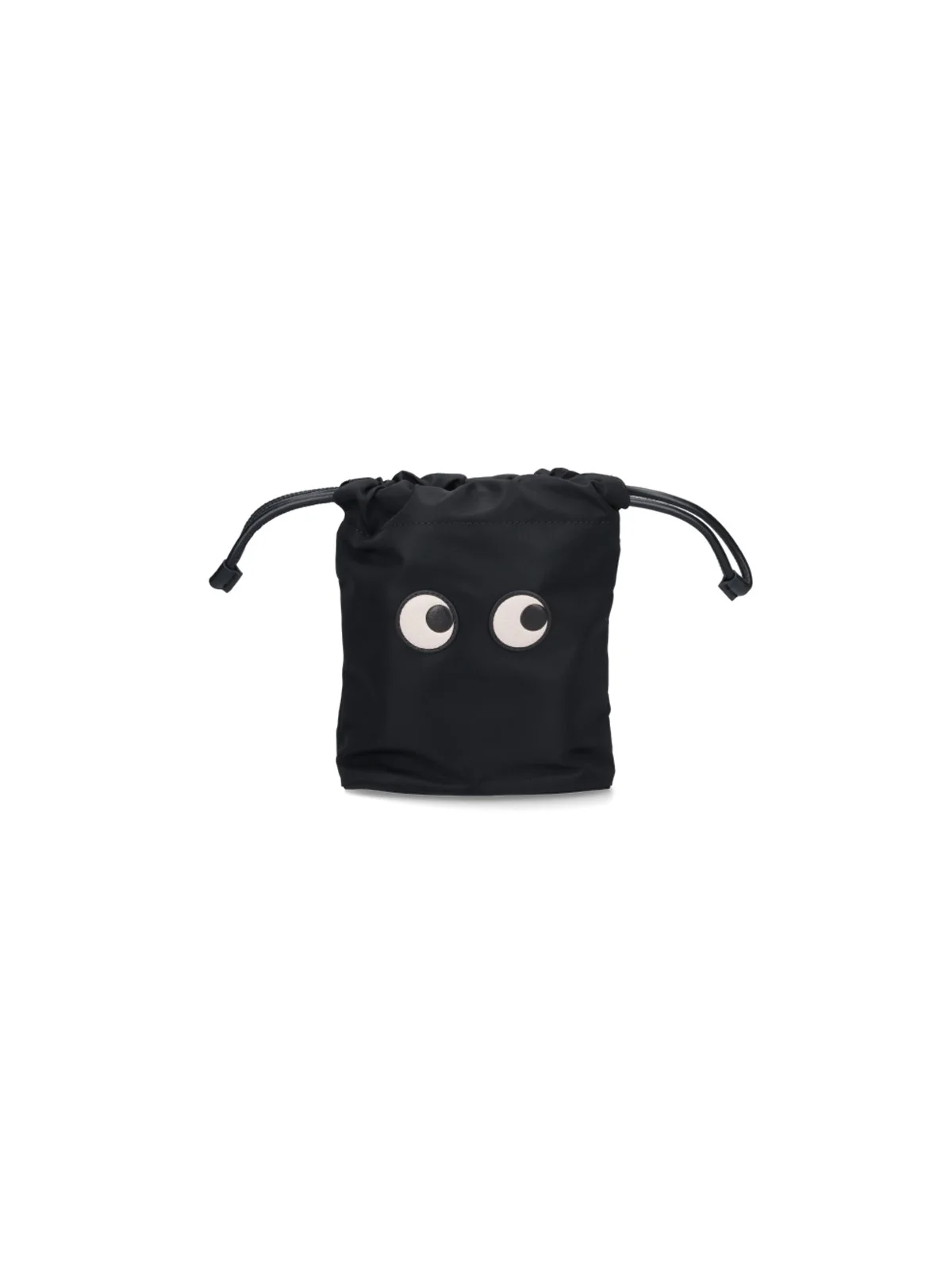 ANYA HINDMARCH "EYES" BUCKET POUCH IN BLACK ECONYL WITH TONE-ON-TONE LEATHER DETAILS, "EYES" PATCH ON THE FRONT, DRAWSTRING CLOSURE, MAIN INNER COMPARTMENT. PRODUCT INFO PRODUCT CODE 193566BLACK COMPOSITION: 100% NYLON SIZE AND FIT: H 17 X W 14 X D 6.5 CM MADE IN: CHINA - PRODUCT MADE FROM RECYCLED MATERIALS - TRIMS: 100% LEATHER