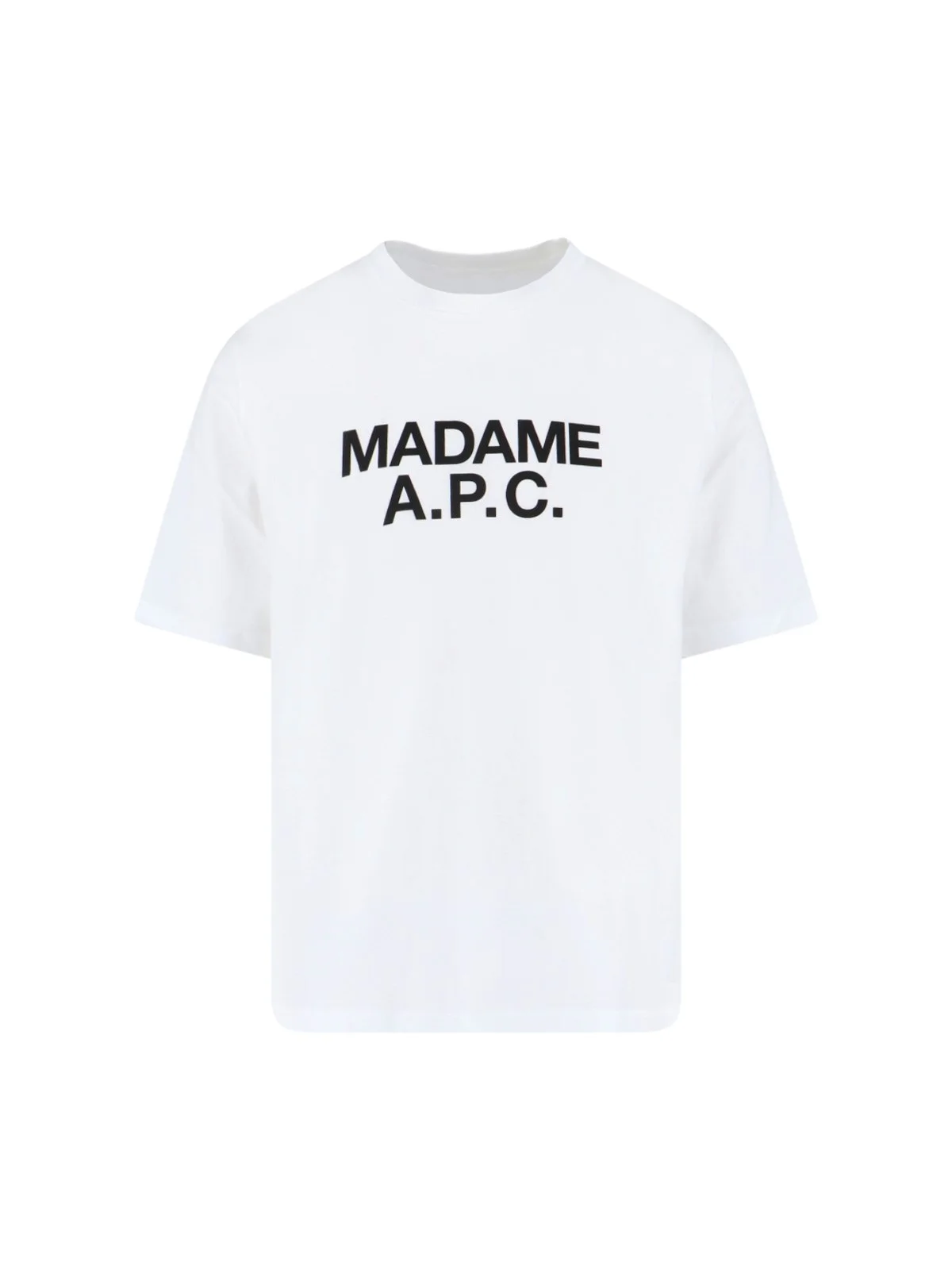 A.P.C. "MADAME" WHITE COTTON CREW NECK T-SHIRT WITH SHORT SLEEVES, CONTRAST LOGO PRINT ON THE FRONT, STRAIGHT HEM. PRODUCT INFO PRODUCT CODE COGYK M26462AAB COMPOSITION: 100% COTTON SIZE AND FIT: REGULAR FIT MADE IN: PORTUGAL