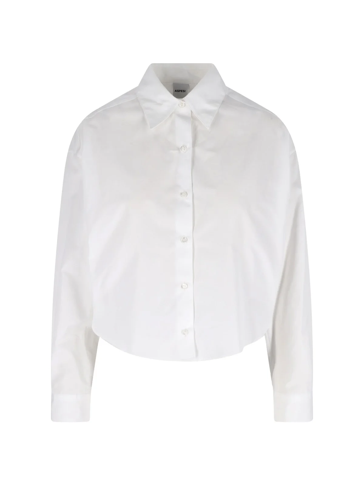 ASPESI WHITE COTTON SHIRT WITH CLASSIC COLLAR, FRONT BUTTON CLOSURE, LONG SLEEVES, CURVED HEM. PRODUCT INFO PRODUCT CODE 5405 D30785072 COMPOSITION: 100% COTTON SIZE AND FIT: CROPPED FIT MADE IN: ROMANIA