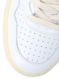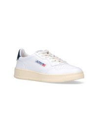 AUTRY LOW "MEDALIST" WHITE LEATHER SNEAKERS WITH PERFORATED ROUND TOE, LACES, LOGO LABEL TAB, BLUE SIDE LOGO PRINT, BLUE LOGO TAB AND CREAM RUBBER SOLE. PRODUCT INFO PRODUCT CODE AULMLL12 - 100% LEATHER - SOLE: 100% RUBBER