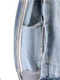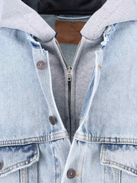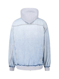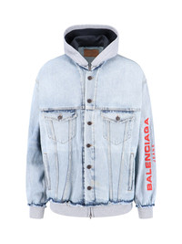 BALENCIAGA BLUE AND GREY DENIM SWEATSHIRT JACKET WITH HOOD DESIGN, ZIP AND BUTTON CLOSURE, TWO CHEST PATCH POCKETS, TWO SIDE POCKETS, RED LETTERING LOGO ON THE SLEEVE, WORN DETAILS ON THE HEM, ELASTIC CUFFS, STRAIGHT HEM. PRODUCT INFO PRODUCT CODE 824304 TSW824200 COMPOSITION: 100% COTTON SIZE AND FIT: SOFT FIT MADE IN: ITALY