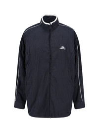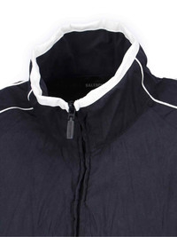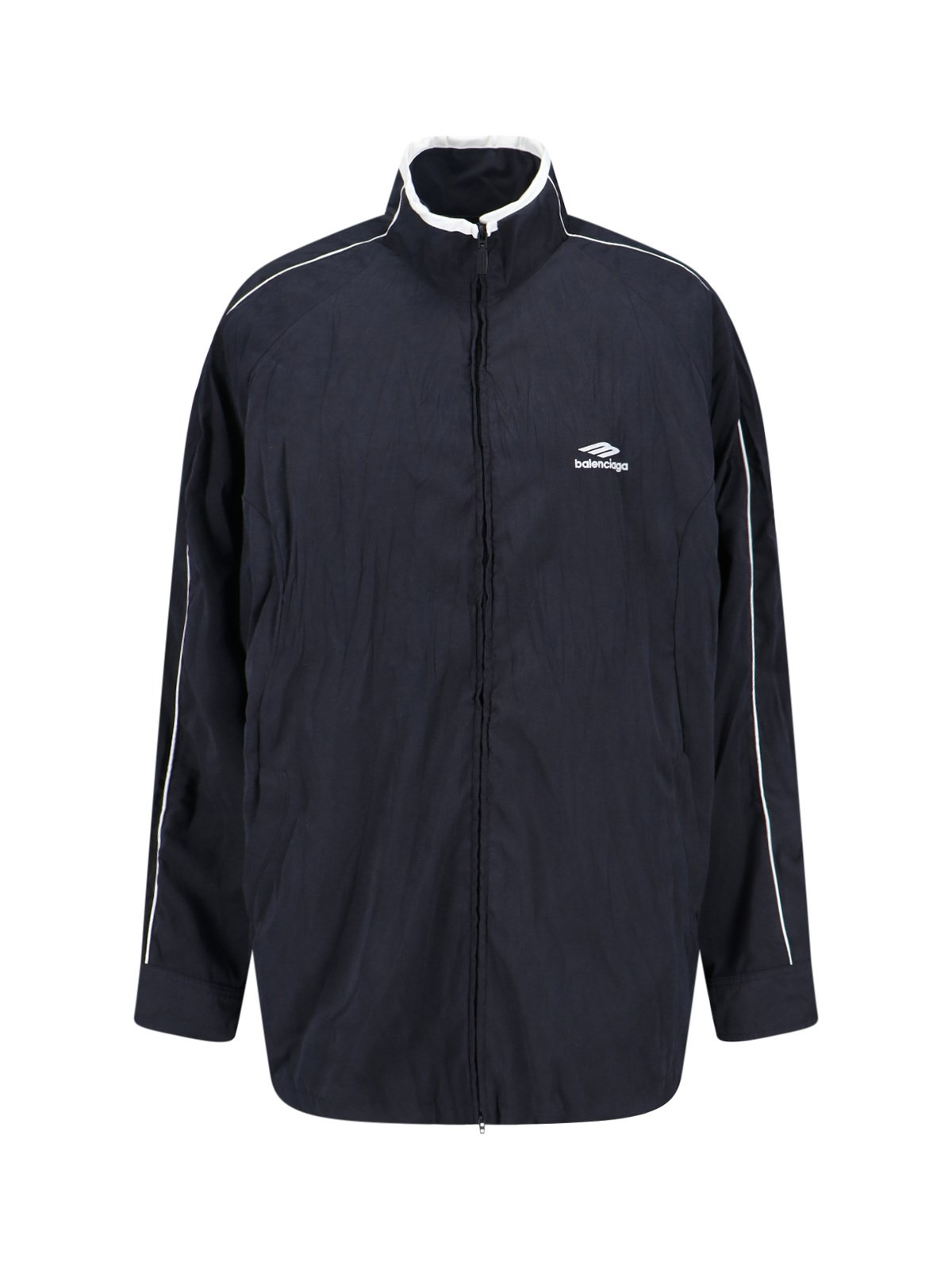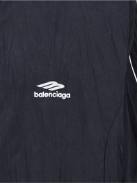 BALENCIAGA LOGO ZIP JACKET IN BLACK FABRIC WITH HIGH NECK, DROPPED SHOULDERS, CONTRASTING EMBROIDERED DETAILS, DOUBLE ZIP CLOSURE, CONTRAST LOGO EMBROIDERY AT THE FRONT, TWO SIDE POCKETS, BUTTON CUFFS, STRAIGHT HEM. PRODUCT INFO PRODUCT CODE 850861 TTO441000 COMPOSITION: 90% POLYESTER, 10% POLYAMIDE SIZE AND FIT: SOFT FIT MADE IN: ITALY