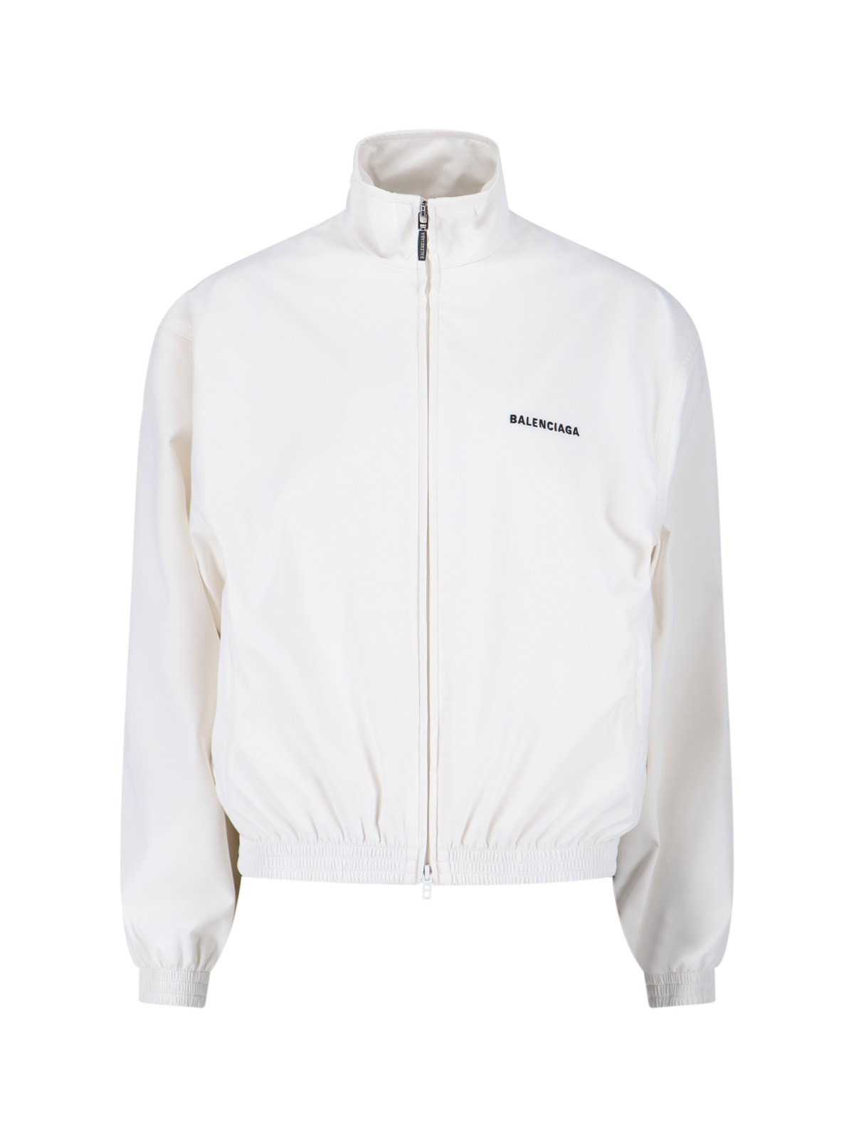 BALENCIAGA LOGO ZIP JACKET IN WHITE FABRIC WITH HIGH NECK, ZIP CLOSURE, CONTRAST LOGO EMBROIDERY AT THE FRONT, TWO SIDE POCKETS, CONTRASTING MAXI LOGO EMBROIDERY AT THE BACK, ELASTIC CUFFS, STRAIGHT ELASTIC HEM. PRODUCT INFO PRODUCT CODE 839091 TRO319012 COMPOSITION: 100% POLYESTER SIZE AND FIT: SOFT FIT MADE IN: ITALY