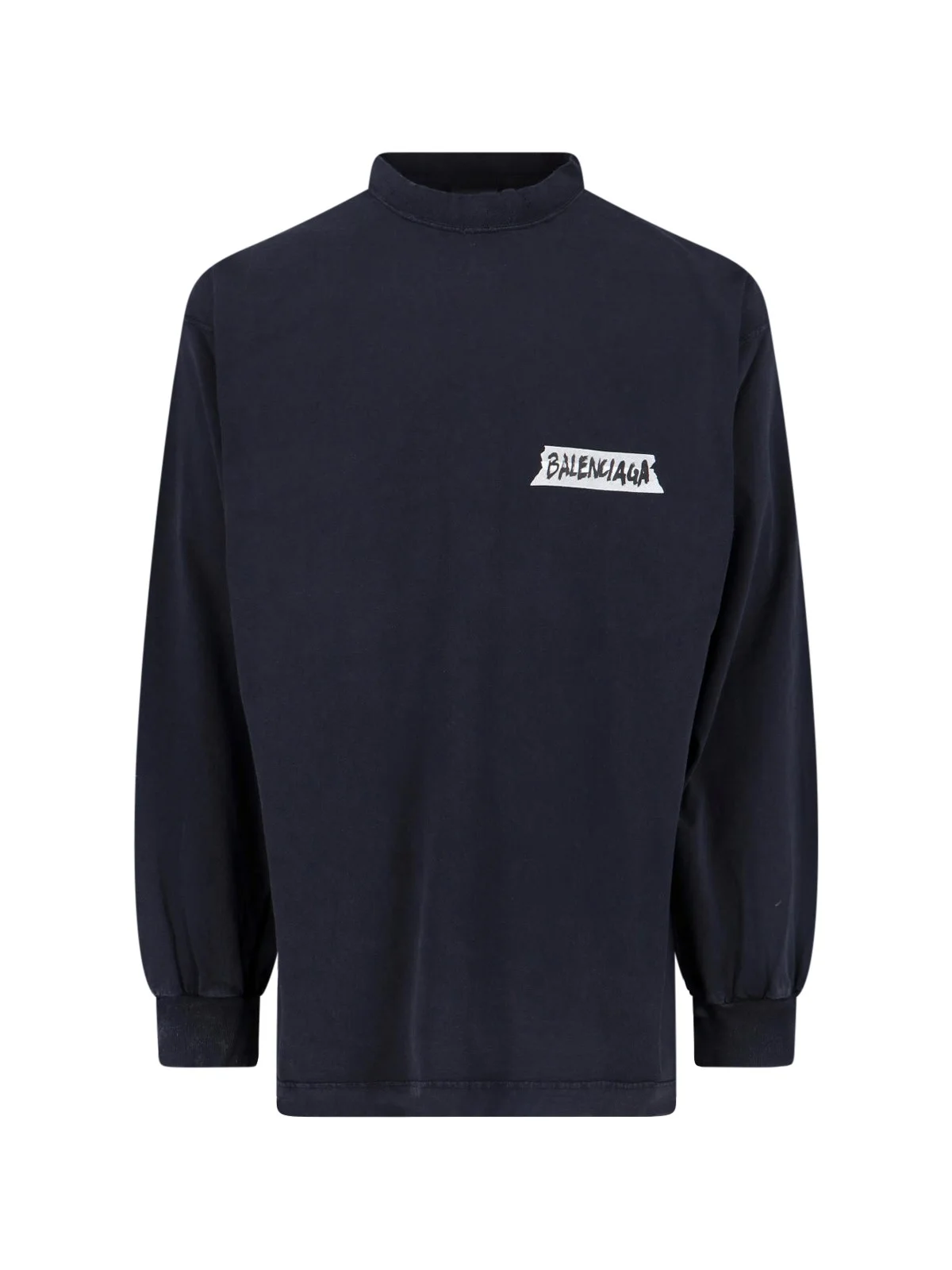 BALENCIAGA 'MASKING TAPE' BLACK COTTON CREW NECK T-SHIRT WITH LONG SLEEVES, CONTRASTING LOGO ON THE FRONT, MAXI LOGO ON THE BACK, DESTROYED DETAILS, STRAIGHT HEM. PRODUCT INFO PRODUCT CODE 850404 TTVL61041 COMPOSITION: 100% COTTON SIZE AND FIT: SOFT FIT MADE IN: PORTUGAL