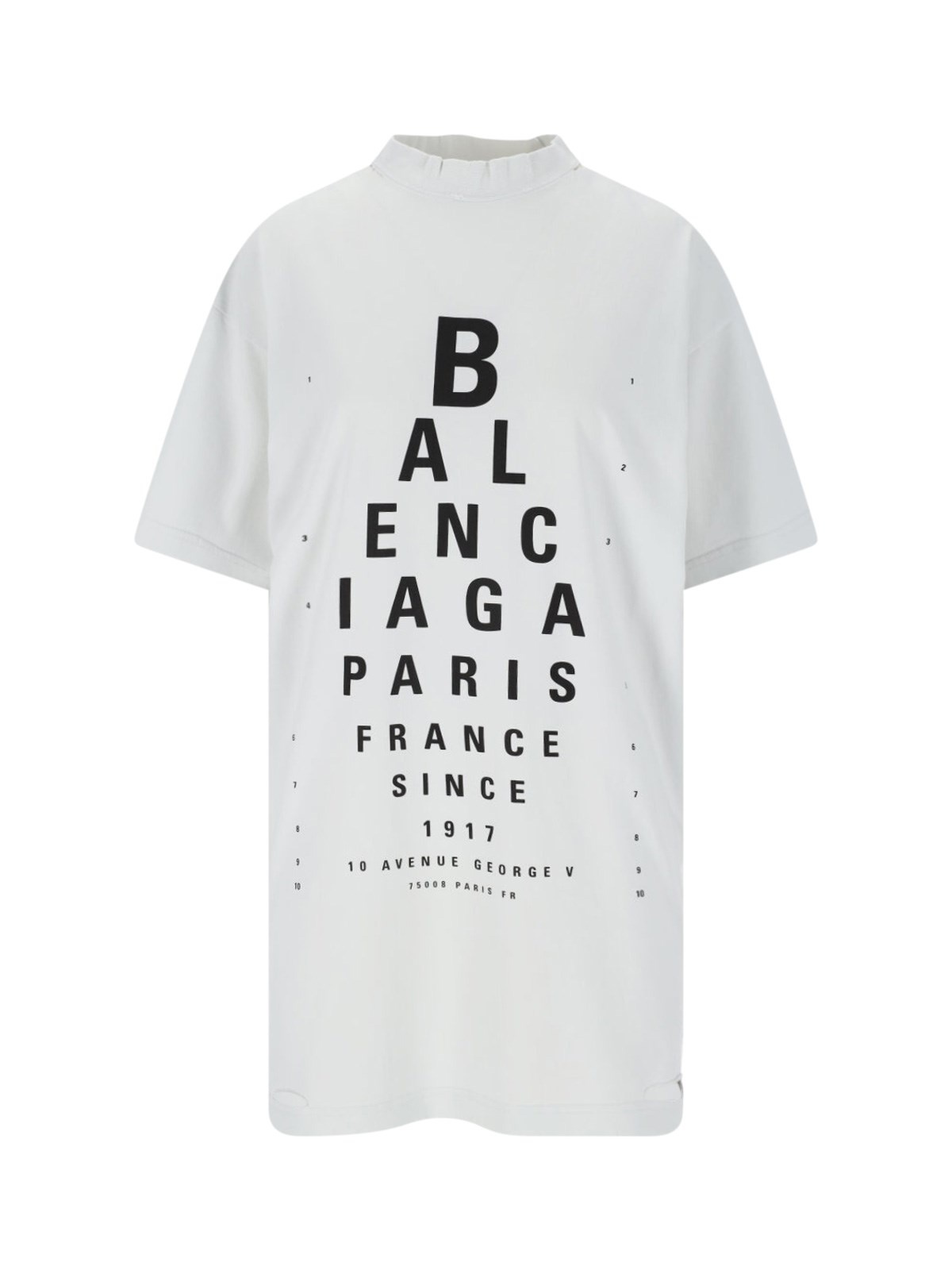 BALENCIAGA 'OPTICAL' WHITE COTTON CREW NECK T-SHIRT WITH SHORT SLEEVES, CONTRAST MAXI LOGO PRINT ON THE FRONT, STRAIGHT HEM. PRODUCT INFO PRODUCT CODE 811688 TRVU69081 COMPOSITION: 100% COTTON SIZE AND FIT: OVERSIZED FIT MADE IN: PORTUGAL - "I/II/III" SIZE SCALE