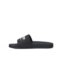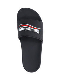 BALENCIAGA 'POOL SIDE' SANDALS IN BLACK RUBBER WITH TOP BAND, CONTRAST 'POLITICAL CAMPAIGN' LOGO DETAIL AT THE FRONT, SLIP-ON FIT, RUBBER SOLE. PRODUCT INFO PRODUCT CODE 776818 W1S801096 COMPOSITION: 100% THERMOPLASTIC POLYURETHANE MADE IN: ITALY