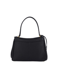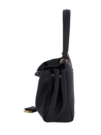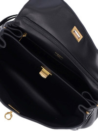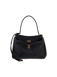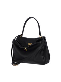 BALENCIAGA 'RODEO' SMALL BLACK LEATHER BAG WITH TOP HANDLE, REMOVABLE LEATHER KEYRING WITH DOUBLE GOLD METAL RING, REMOVABLE SHOULDER STRAP, FLAP TURN-AROUND CLOSURE, ADJUSTABLE WITH SIDE PRESS BUTTONS, TWO FLAT BACK POCKETS, INNER ZIP POCKET, TWO SEPARATE INNER COMPARTMENTS, GOLD METAL FEET ON THE BOTTOM. PRODUCT INFO PRODUCT CODE 789779 2ABV51000 COMPOSITION: 100% CALF LEATHER SIZE AND FIT: H 20 X W 29 X D 10 CM MADE IN: ITALY - HANDLE DROP: 18.5 CM - STRAP DROP: 56.5 CM