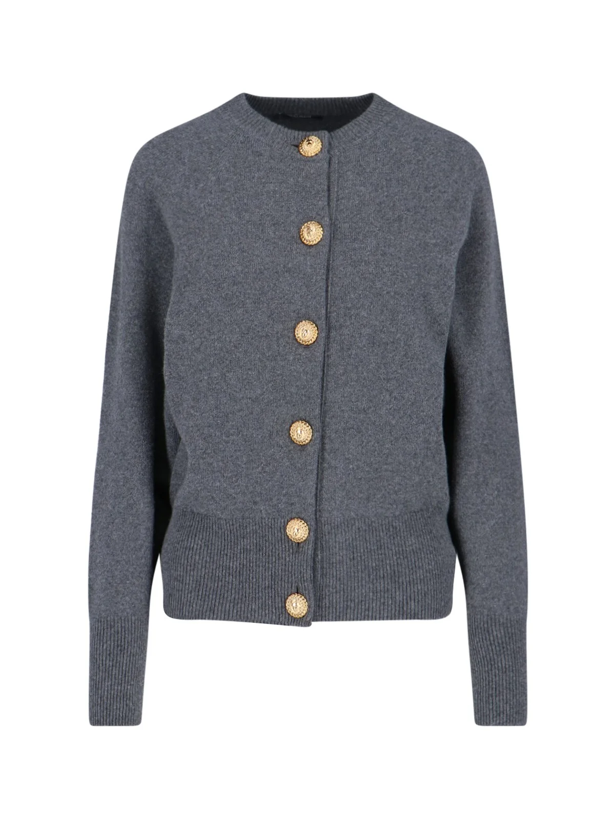 BALMAIN GREY CASHMERE BLEND CARDIGAN WITH CREW NECK, LONG SLEEVES, GOLD METAL BUTTON CLOSURE, RIBBED TRIMS, STRAIGHT HEM. PRODUCT INFO PRODUCT CODE GF1KL270KI879AY COMPOSITION: 50% CASHMERE, 50% VIRGIN WOOL SIZE AND FIT: REGULAR FIT MADE IN: FRANCE