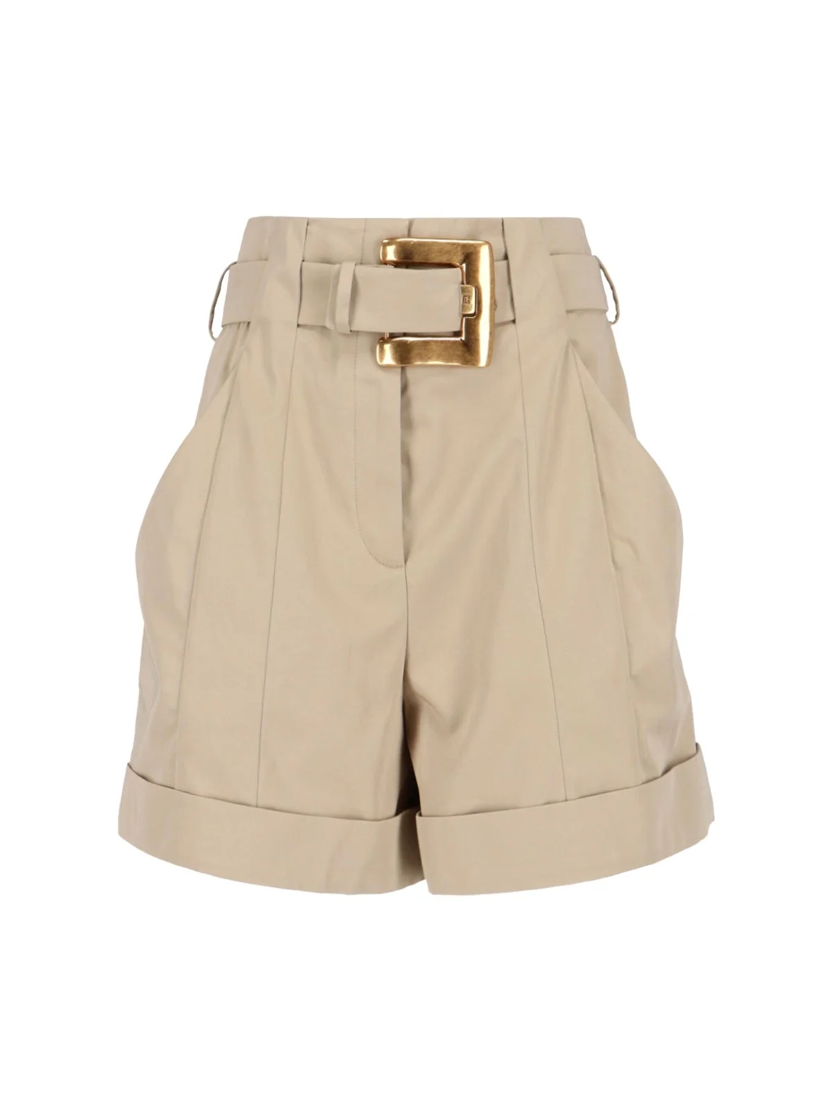 BALMAIN BEIGE COTTON GABARDINE SHORTS WITH HIGH WAIST ADJUSTABLE BELT DETAIL, GOLD METAL ANTHEM BUCKLE, TWO SIDE POCKETS, STRAIGHT LEG. PRODUCT INFO PRODUCT CODE GF1PA375CG430AN COMPOSITION: 100% COTTON SIZE AND FIT: REGULAR FIT MADE IN: PORTUGAL