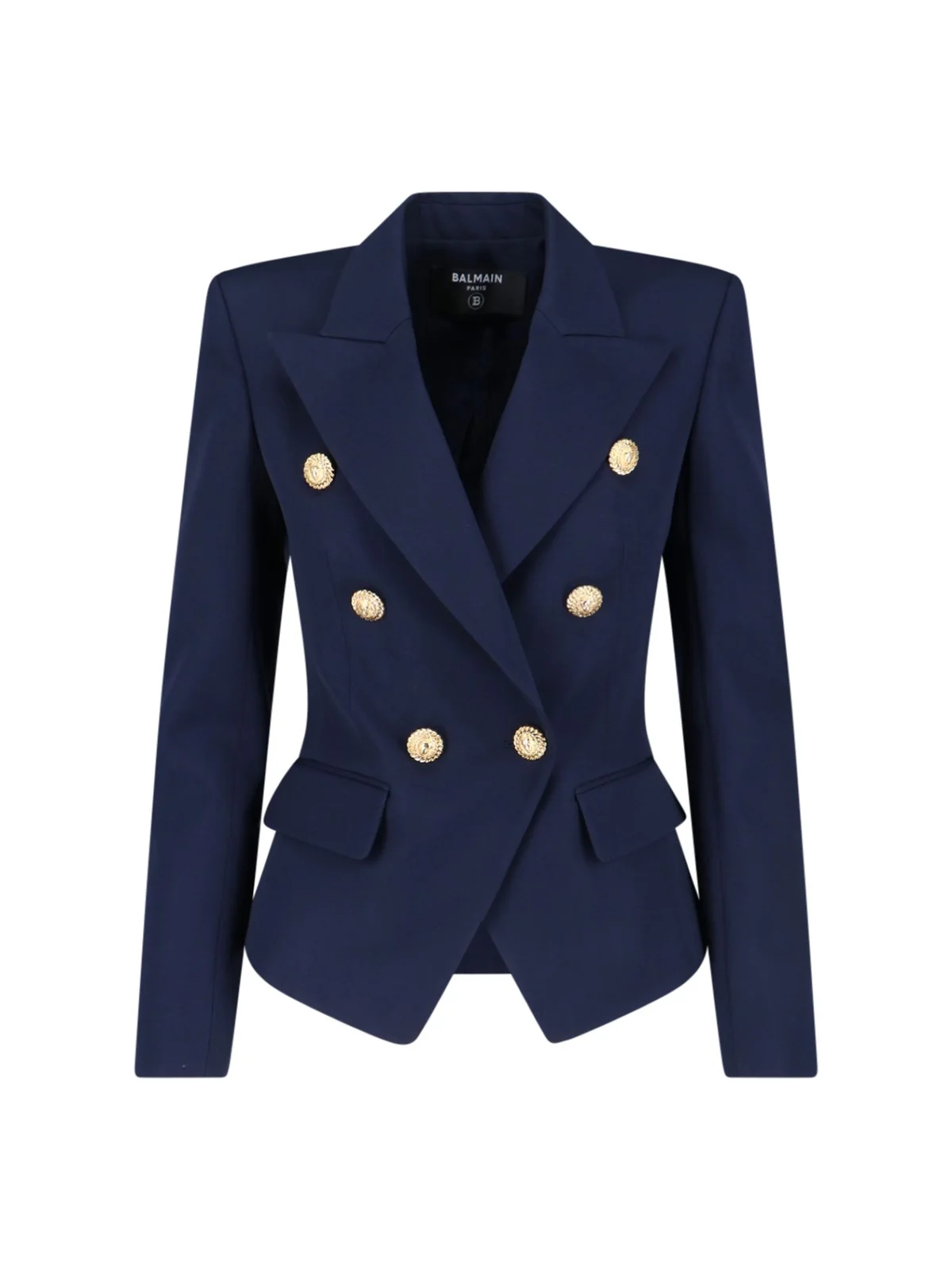 BALMAIN DOUBLE-BREASTED BLAZER IN BLUE VIRGIN WOOL WITH PEAK LAPELS, GOLD METAL BUTTON CLOSURE, TWO SIDE POCKETS, BUTTON CUFFS, CURVED HEM. PRODUCT INFO PRODUCT CODE GF1SI505WB086UC COMPOSITION: 100% VIRGIN WOOL SIZE AND FIT: REGULAR FIT MADE IN: PORTUGAL - TRIMS: 100% METAL