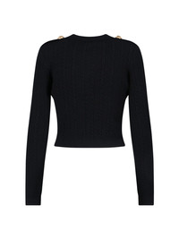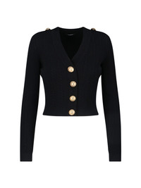 BALMAIN KNIT CARDIGAN IN BLACK VISCOSE BLEND WITH V-NECK, STRUCTURED SHOULDERS, DECORATIVE BUTTON DETAIL, DECORATIVE SNAP BUTTON CLOSURE, RIBBED TRIM, STRAIGHT HEM. PRODUCT INFO PRODUCT CODE FF1KL245KI500PA COMPOSITION: 83% VISCOSE, 17% POLYESTER SIZE AND FIT: REGULAR FIT MADE IN: FRANCE