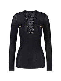 BALMAIN LACE UP TOP IN BLACK FABRIC WITH RIBBED KNIT, V-NECK, LACE-UP CLOSURE, TWO SIDE FLAP POCKETS, GOLD BUTTON DETAILS, AND STRAIGHT HEM. PRODUCT INFO PRODUCT CODE FF1GD019JC550PA COMPOSITION: 95% VISCOSE, 5% ELASTANE SIZE AND FIT: REGULAR FIT MADE IN: PORTUGAL