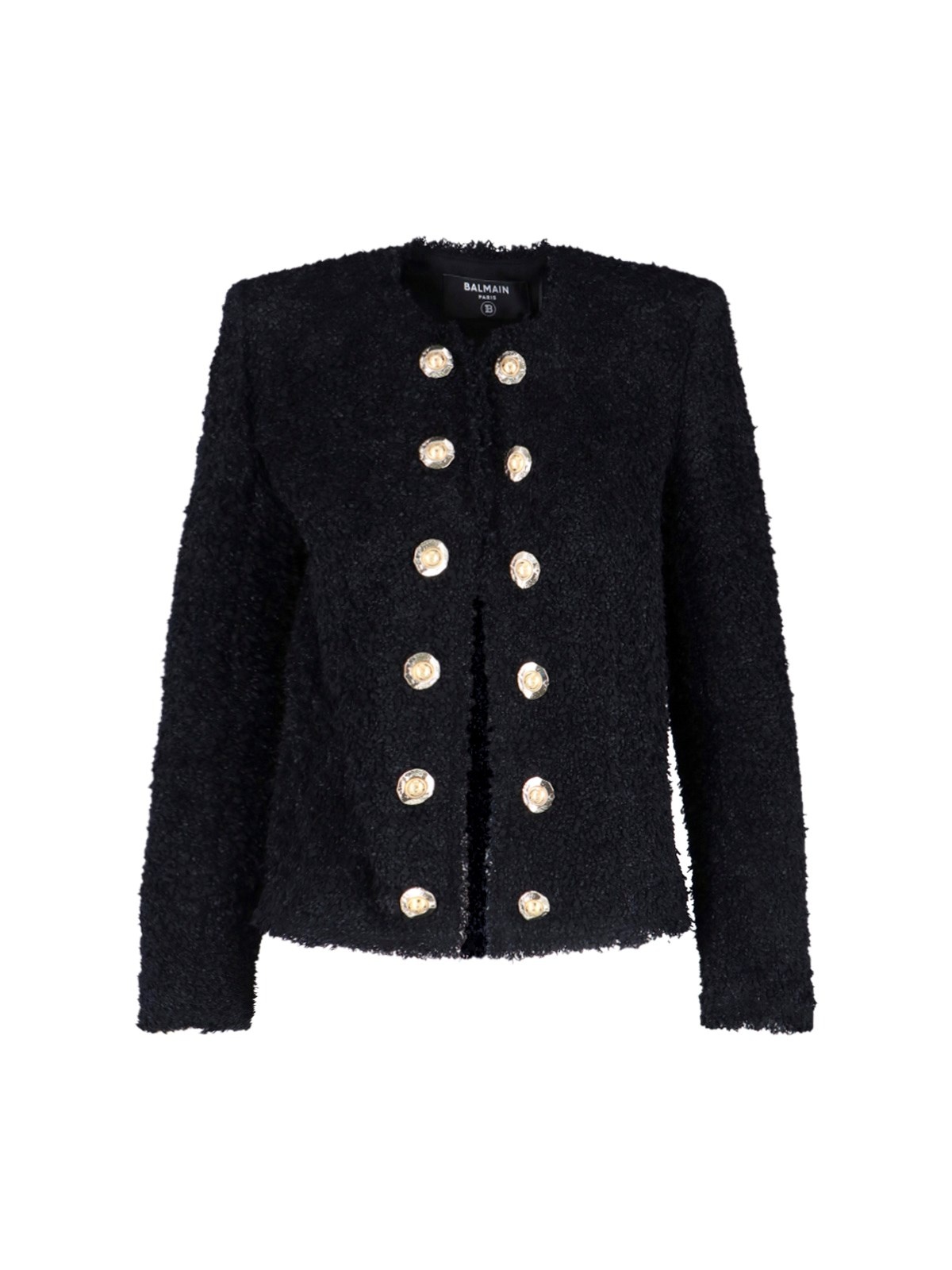 BALMAIN TWEED JACKET IN BLACK NYLON WITH FRAYED DETAILS, CREW NECK, STRUCTURED SHOULDERS, BUTTON CLOSURE, GOLD METAL DECORATIVE BUTTONS ON THE FRONT, BUTTON CUFFS, STRAIGHT HEM. PRODUCT INFO PRODUCT CODE FF1SM508XC670PA COMPOSITION: 100% POLYAMIDE SIZE AND FIT: REGULAR FIT MADE IN: POLAND