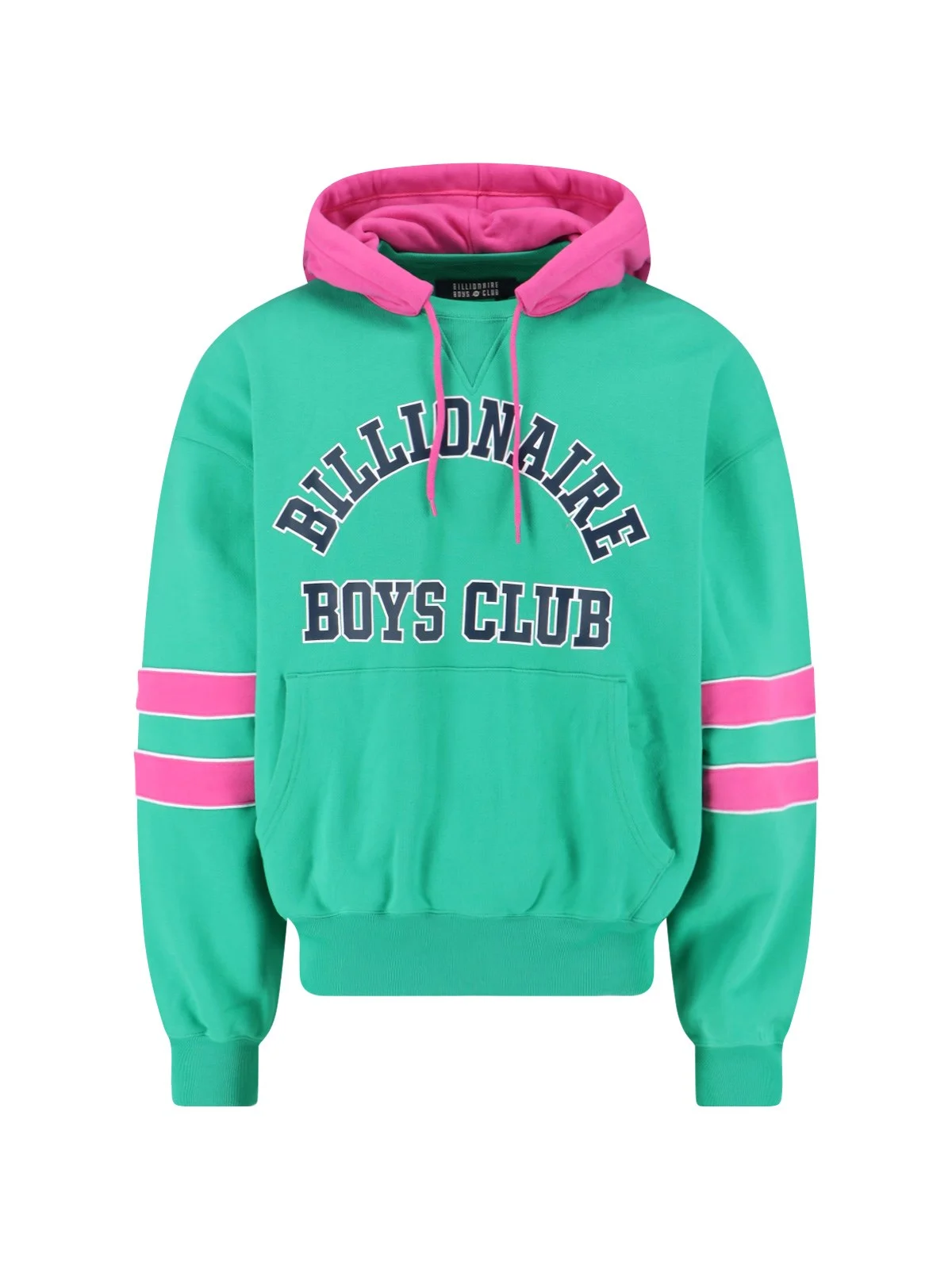 BILLIONAIRE BOYS CLUB LOGO HOODIE IN GREEN AND PINK COTTON WITH DRAWSTRING HOOD, MAXI LOGO PRINT ON THE FRONT, CONTRASTING BAND DETAIL ON THE SLEEVES, MAXI FRONT POCKET, LOGO PRINT ON THE BACK, RIBBED TRIMS, STRAIGHT HEM. PRODUCT INFO PRODUCT CODE B25247GREEN PINK COMPOSITION: 100% COTTON SIZE AND FIT: OVERSIZED FIT MADE IN: CHINA