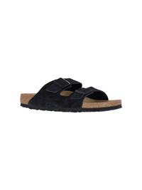 BIRKENSTOCK ARIZONA SANDALS IN BLACK SUEDE WITH TWO ADJUSTABLE TOP BANDS, SLIP-ON FIT, ANATOMICAL CORK AND LATEX FOOTBED, AND RUBBER SOLE. PRODUCT INFO PRODUCT CODE 1027164BLACK COMPOSITION: 100% LEATHER MADE IN: GERMANIA - SOLE: 100% RUBBER