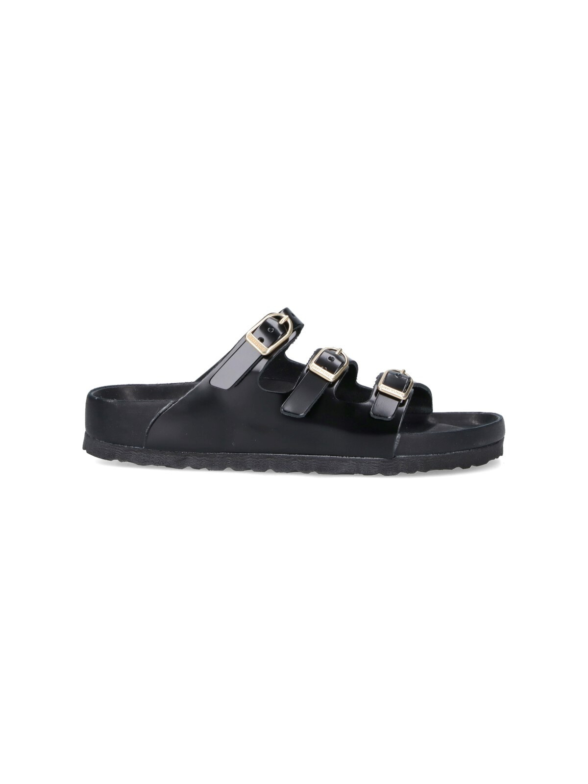BIRKENSTOCK FLORIDA SANDALS IN BLACK CALF LEATHER WITH ROUND TOE, GOLD METAL BUCKLE CLOSURE, TONE-ON-TONE EMBOSSED LOGO ON THE SIDE, SLIP-ON FIT, AND RUBBER SOLE. PRODUCT INFO PRODUCT CODE 1029385SHINE BLACK COMPOSITION: 100% CALF LEATHER MADE IN: GERMANY - SOLE: 100% RUBBER