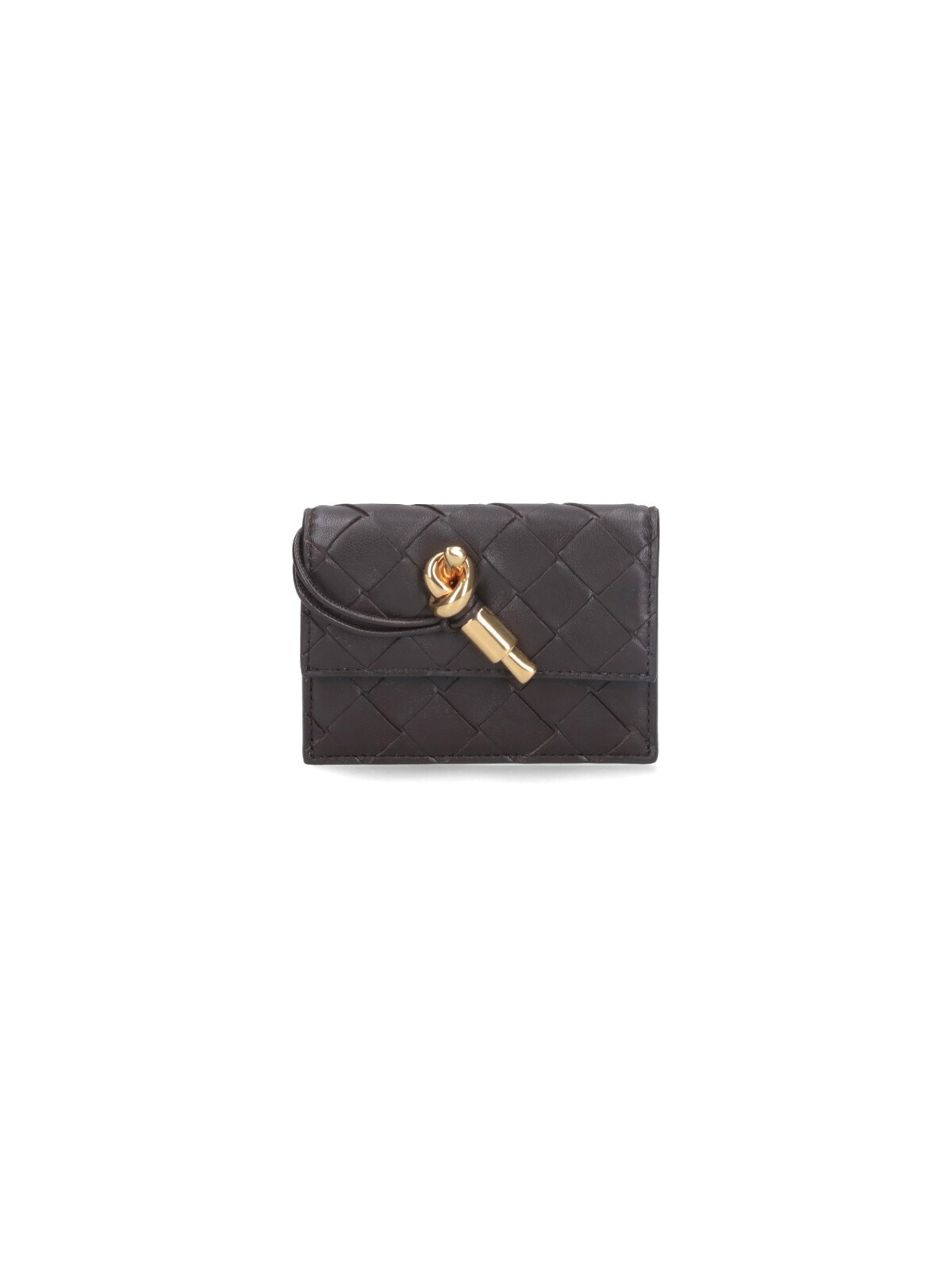 BOTTEGA VENETA 'ANDIAMO' CARD HOLDER IN BROWN LAMBSKIN WITH 'INTRECCIATO' PATTERN, GOLD METAL 'KNOT' LOGO DETAIL ON THE FRONT, FLAP CLOSURE, MAIN INNER COMPARTMENT, THREE CARD SLOTS ON THE BACK. PRODUCT INFO PRODUCT CODE 838845 VCPP22190 COMPOSITION: 100% LAMBSKIN SIZE AND FIT: H 8 X W 10.5 X D 3.5 CM MADE IN: ITALY - TRIMS: 100% METAL